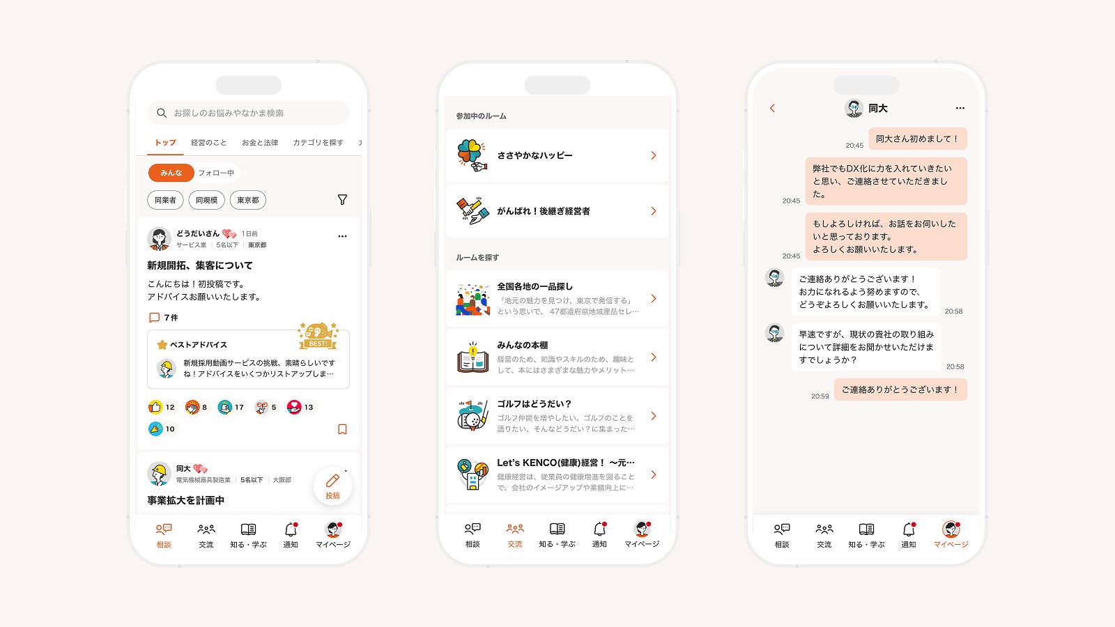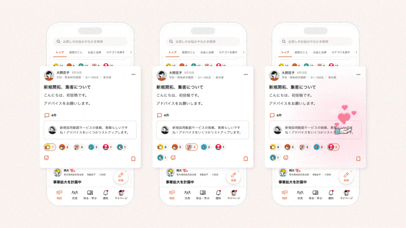 経営者同士のコミュニケーションをより豊かにするため、多彩なリアクション機能や、思いやりが伝わるマイクロインタラクション(アニメーション効果)を実装しました。また、アプリの背景色には柔らかく親しみのある「オレンジ入りのライトグレー」を採用。心理的に明るく温かい環境をつくることで、活発で気軽な交流を後押ししています。
