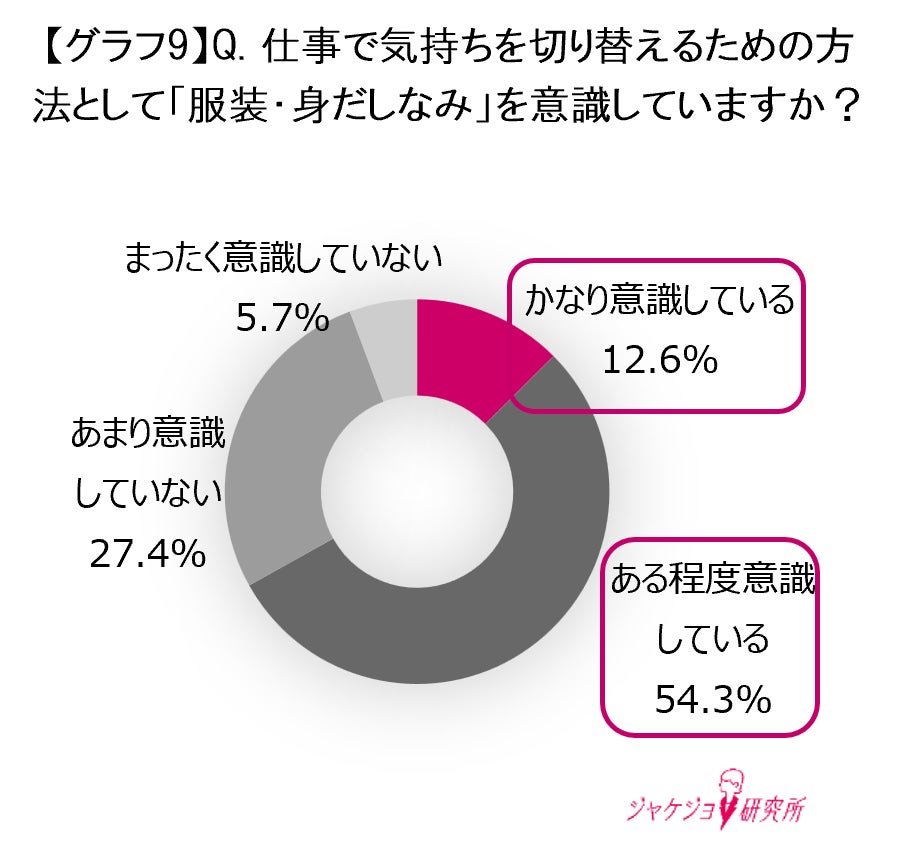 また、仕事で気持ちを切り替えるための方法として、服装や身だしなみに関して質問したところ、66.9%(「かなり意識している」「ある程度意識している」の合計)の女性が、気持ちを切り替えるスイッチとして「服装・身だしなみ」を意識していると回答しました(グラフ9)。