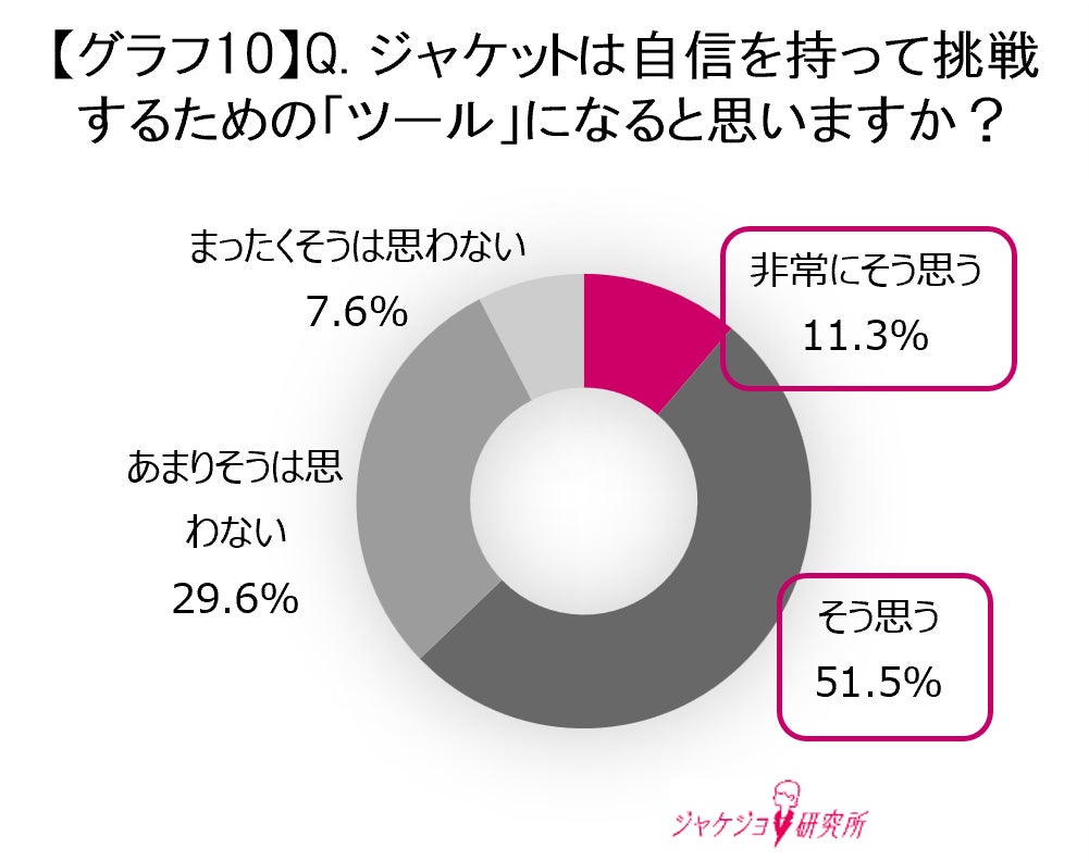 さらに、「ジャケット」がキャリアにおける様々な障壁を乗り越え、自信を持って挑戦するための「ツール」になり得ると思いますか?という質問に対して、全体の62.8%が「非常にそう思う」「そう思う」と回答。装いが内面に与えるポジティブな影響が裏付けられました(グラフ10)。
