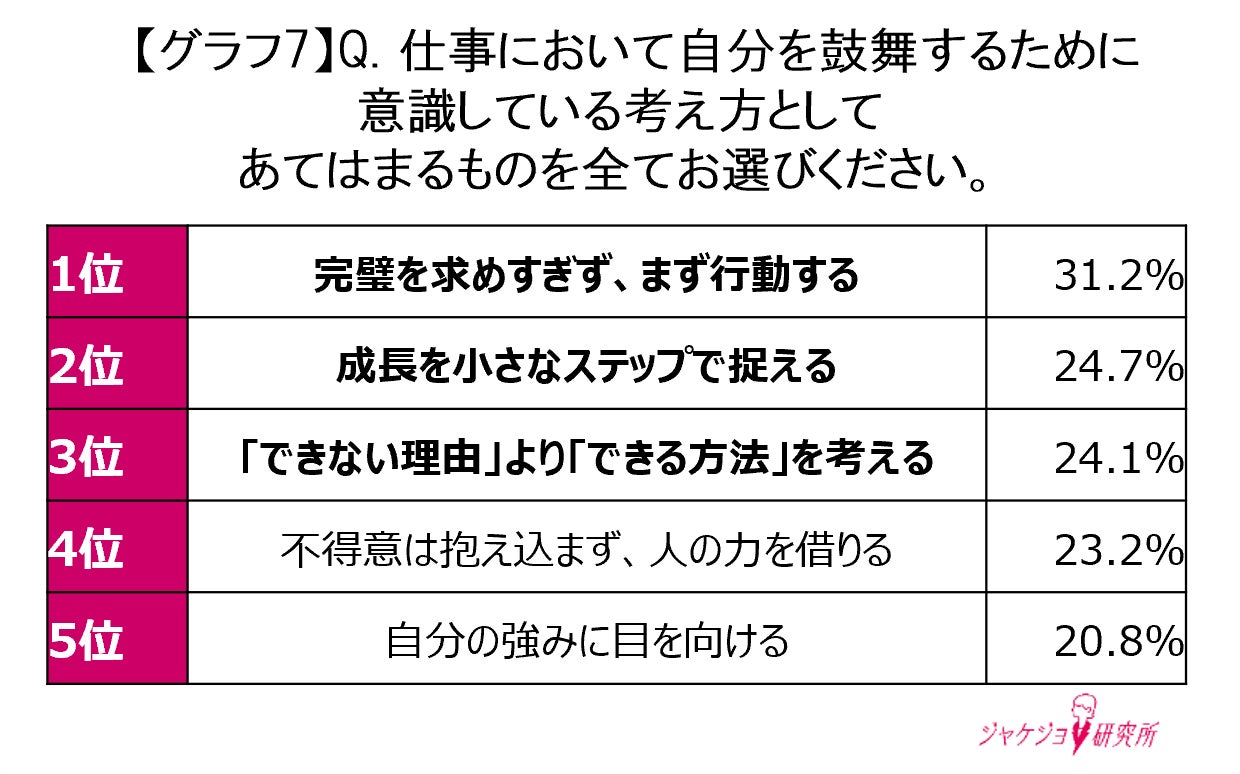 仕事で自信を保ちモチベーションを高めるために、女性たちは普段からどのような工夫をしているのでしょうか。まず、マインド面では「完璧を求め過ぎず、まず行動する」(31.2%)や「成長を小さなステップで捉える」(24.7%)など、特別なことではなく日々の小さな積み重ねで心を整える「セルフケア」を取り入れ、自己肯定感を育む工夫を凝らしています(グラフ7)。行動面では「仕事とプライベートの境界線を設計する」(27.3%)や自分の強み領域のスキルアップを継続する」(20.7%)といった時間効率の工夫や積極的な学習行動をとっていることがわかりました(グラフ8)。