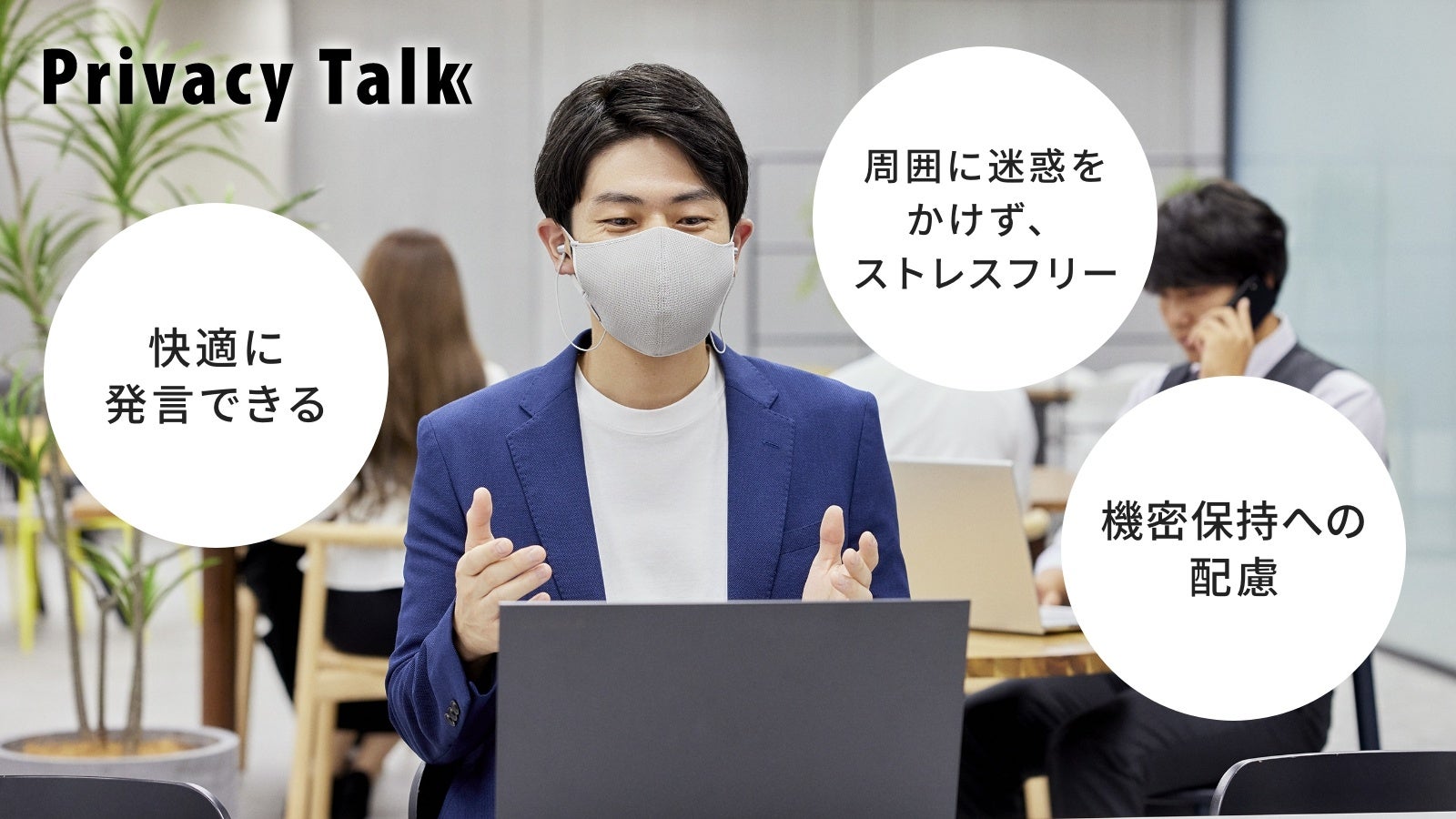 「Privacy Talk」は、イヤホン・マイク・ファンを搭載した減音効果のある装着型の減音デバイスです。装着時に発した声を減音し、周囲の雑音を軽減するほか、換気用ファンの搭載により通気性を確保しています。オフィスやカフェなど幅広いシーンで装着できるスタイリッシュなデザインを実現し、さまざまな場所や環境において快適なオンラインコミュニケーションをサポートします。