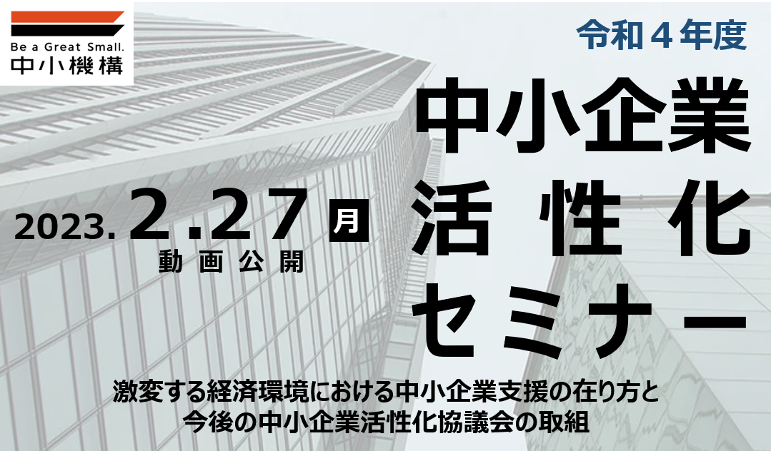 独立行政法人中小企業基盤整備機構(理事長:豊永厚志 本部:東京都港区)は、事業再生に関する課題解決のための知見・ノウハウ・経験の共有化を図ることを目的として、「中小企業活性化セミナー」を令和5年2月27日にオンライン(YouTube限定配信)にて開催します。