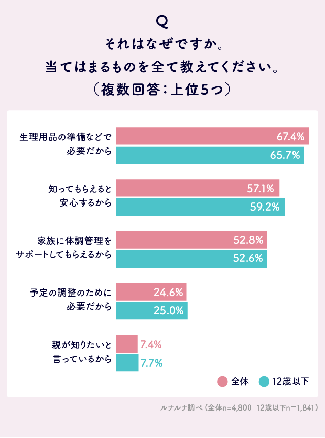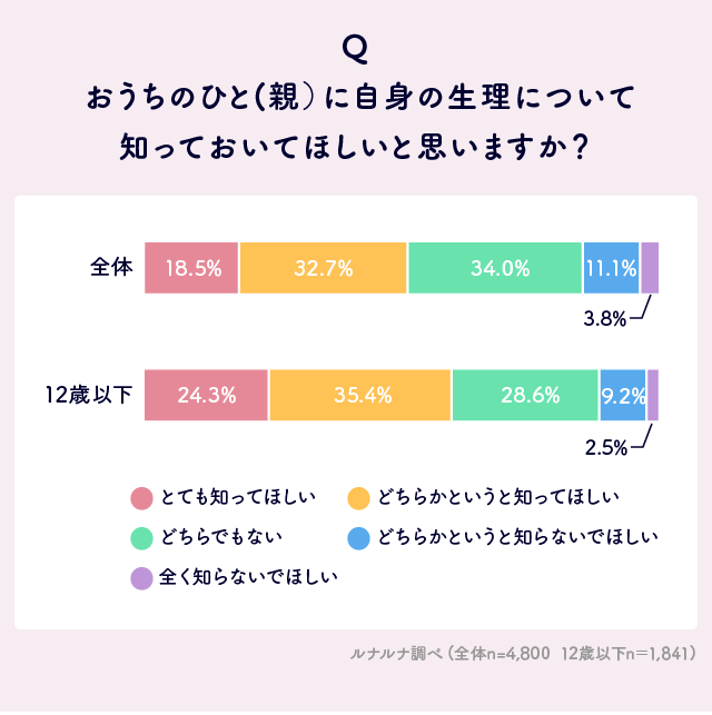 『ルナルナ』の「ジュニアモード」を利用中の女性(10歳~15歳)に、親に自身の生理について知っておいてほしいと思うかを聞いたところ※1、「とても知ってほしい」18.5%、「どちらかというと知ってほしい」32.7%を合わせると、約5割の人が知ってほしいと思っていることがわかりました。また、初潮が始まる前後の12歳以下に絞ってみると、「とても知ってほしい」24.3%、「どちらかというと知ってほしい」35.4%を合わせると約6割となり、1割ほど高い結果となりました。その理由は、1位「生理用品の準備などで必要だから」、2位「知ってもらえると安心するから」、3位「家族に体調管理をサポートしてもらえるから」となりました。初潮後は経血量が少なかったり定期的に生理が来なかったりするほか、生理痛が起こる、情緒が不安定になるなど、初めての経験で不安に思う
