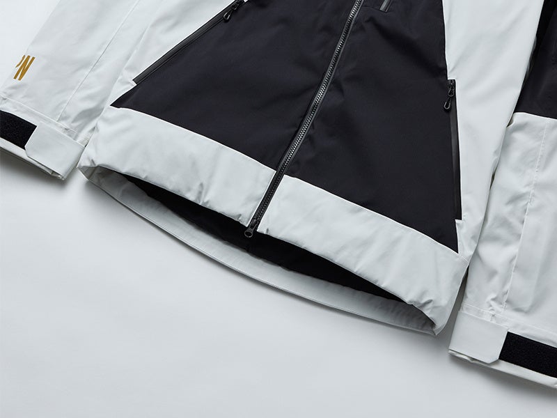 今回、錯視効果を応用し、ジャケットの裾に白の切り替えを入れることで足をより長く見せるデザインを施しました。さらに、膝位置の黒のカラー配置は前回デザインから大きく改良し、パンツ全体には雪と同系色の白を配しました。これらにより、動きをダイナミックに見せることで、見映えに寄与するデザインになっています。