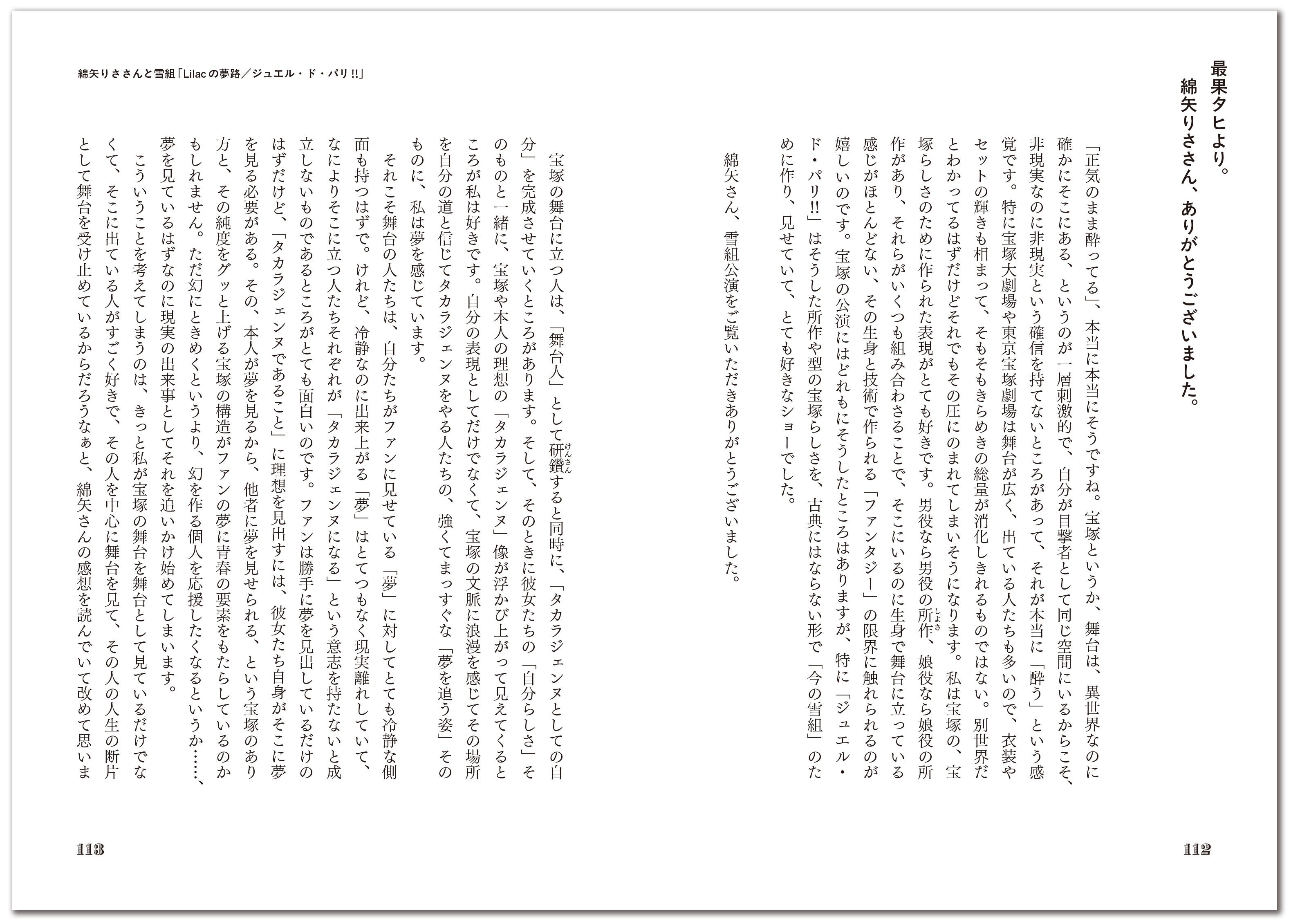 朝吹真理子、犬山紙子、岡崎琢磨、勝田文、末次由紀、名久井直子、はるな檸檬、ヒグチユウコ、穂村弘、吉澤嘉代子、綿矢りさ。豪華11人のゲストたちと交わされる宝塚愛あふれる手紙たち。