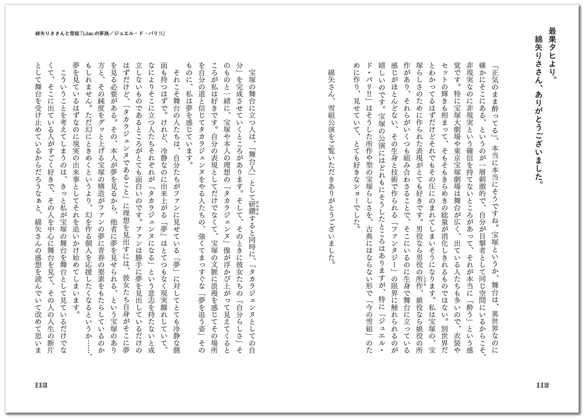 「(パンフレットを見て)幕が上がる前から完全に現実を超越しました」「赤い唇に、夢のなかにしか存在しない男性を感じています」「人は異空間を作れてしまうんですね」――男役と娘役、お化粧とお衣装、デュエットダンス、ウインク、退団公演……夢ときらめきに満ちた舞台に魅了されたゲストが、言葉で、絵で、マンガでしたためた最果さんへの返信と、最果さんから届いたさらなる手紙たち――。