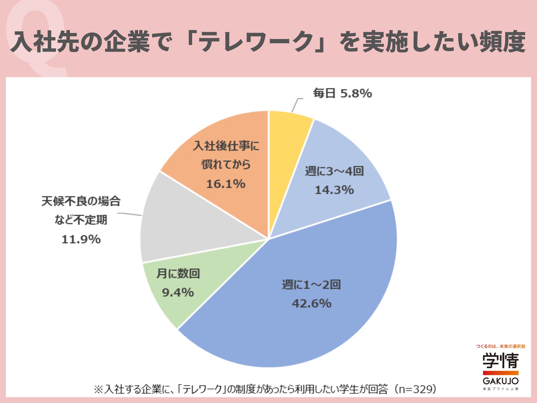 入社先の企業で「テレワーク」を実施したい頻度は、「週に1~2回」が42.6%で最多となりました。次いで、「入社後仕事に慣れてから」16.1%、「週に3~4回」14.3%が続きました。