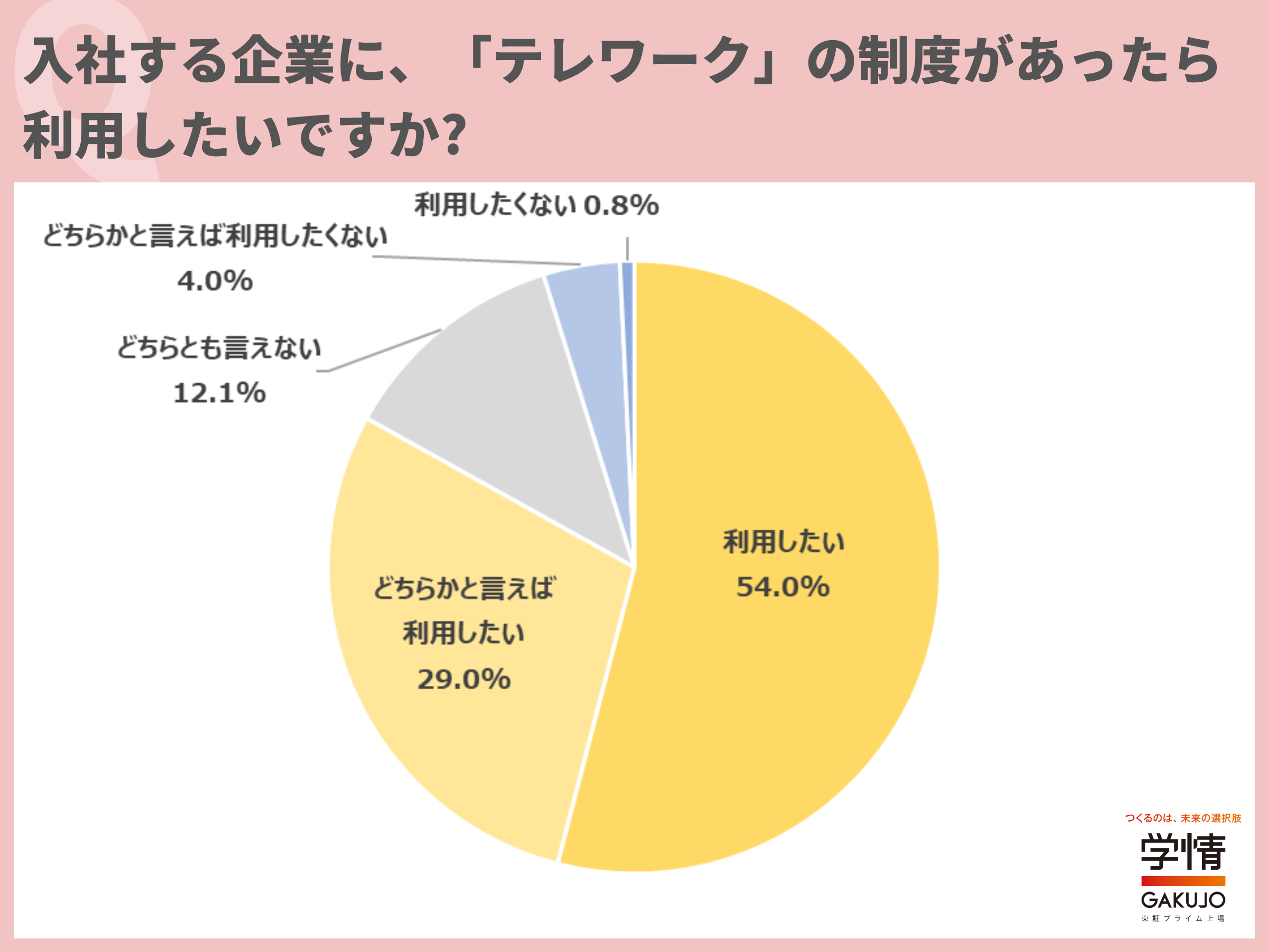 入社する企業に「テレワーク」の制度があったら「利用したい」と回答した新社会人が54.0%に上りました。「どちらかと言えば利用したい」29.0%を合わせると、8割以上の新社会人がテレワークの制度を利用したいとしています。「業務や職場の雰囲気に慣れてきたら、テレワークも活用したい」「通勤時間がない分、時間を有効活用できると思う」「朝の時間を有効活用できるのは魅力的だと思う」「業務によってはテレワークのほうが集中できるものもあると思う」などの声が上がりました。