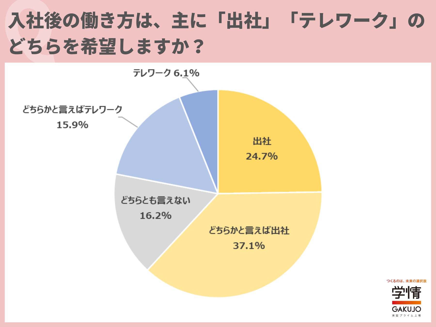出社後の働き方は、「出社」を希望する新社会人が24.7%に上りました。「どちらかと言えば出社」37.1%を合わせると、6割以上の新社会人が「出社」を希望していることが分かります。