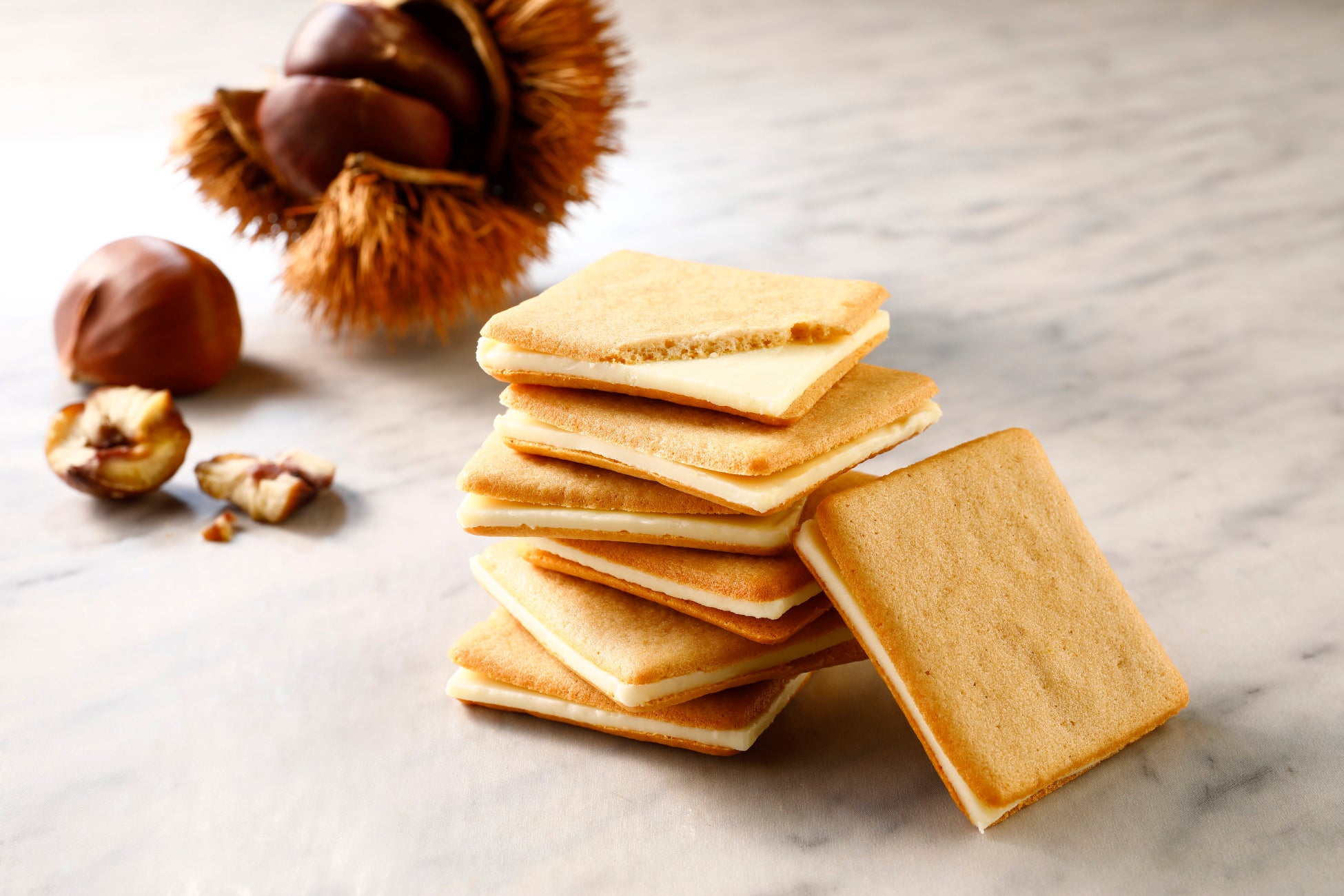イタリア産の栗を使用したパウダーを練り込んで焼き上げた生地に、ミルク感のあるやさしい甘さのマスカルポーネチーズのチョコレートをサンドしたクッキーです。