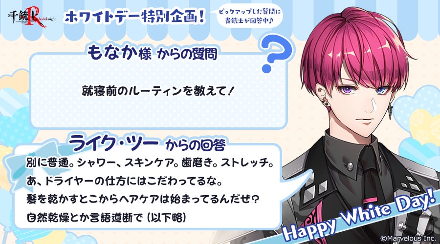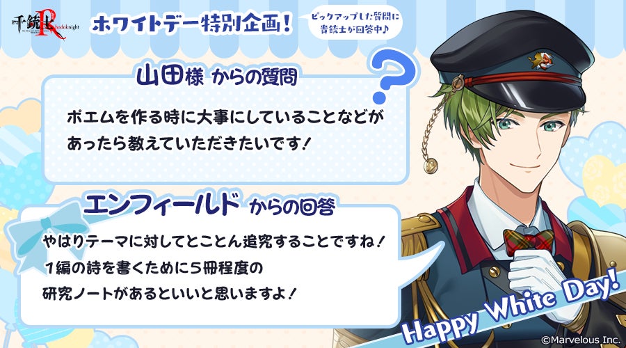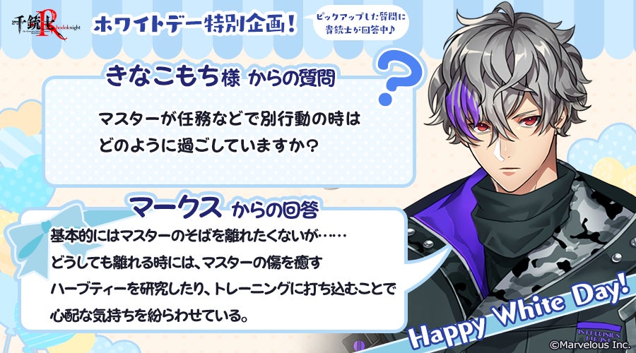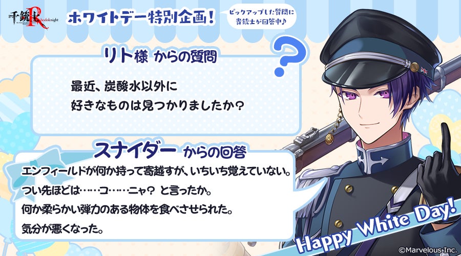 株式会社マーベラス(代表取締役社長 許田周一/所在地:東京都品川区)による、『千銃士』プロジェクトの完全新作スマートフォンゲーム『千銃士:Rhodoknight』(読み:せんじゅうし ろーどないと 以降、『千銃士R』)は、Twitterにて「ホワイトデー特別企画!」として募集していた貴銃士への質問の回答を公開中です。また、ゲーム内ではホワイトデー限定のボイスの公開や特別なログインボーナスを開催中です。