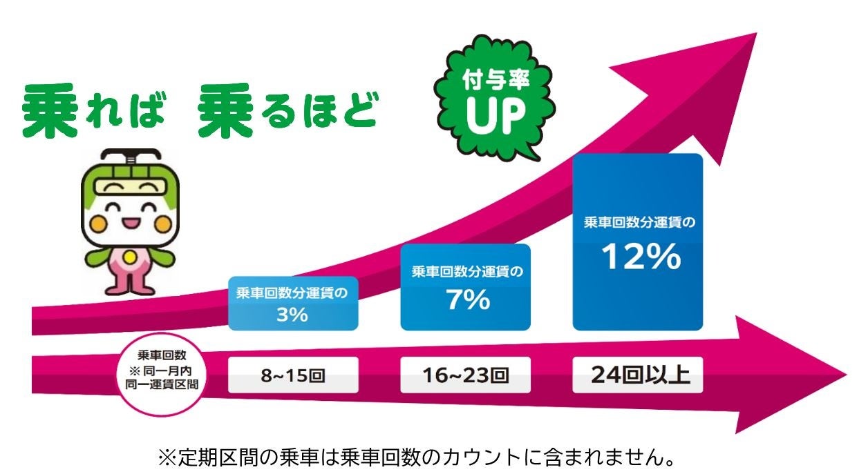 ご利用時に、同一月内に同一運賃区間の乗車回数に応じてポイントを付与します。
