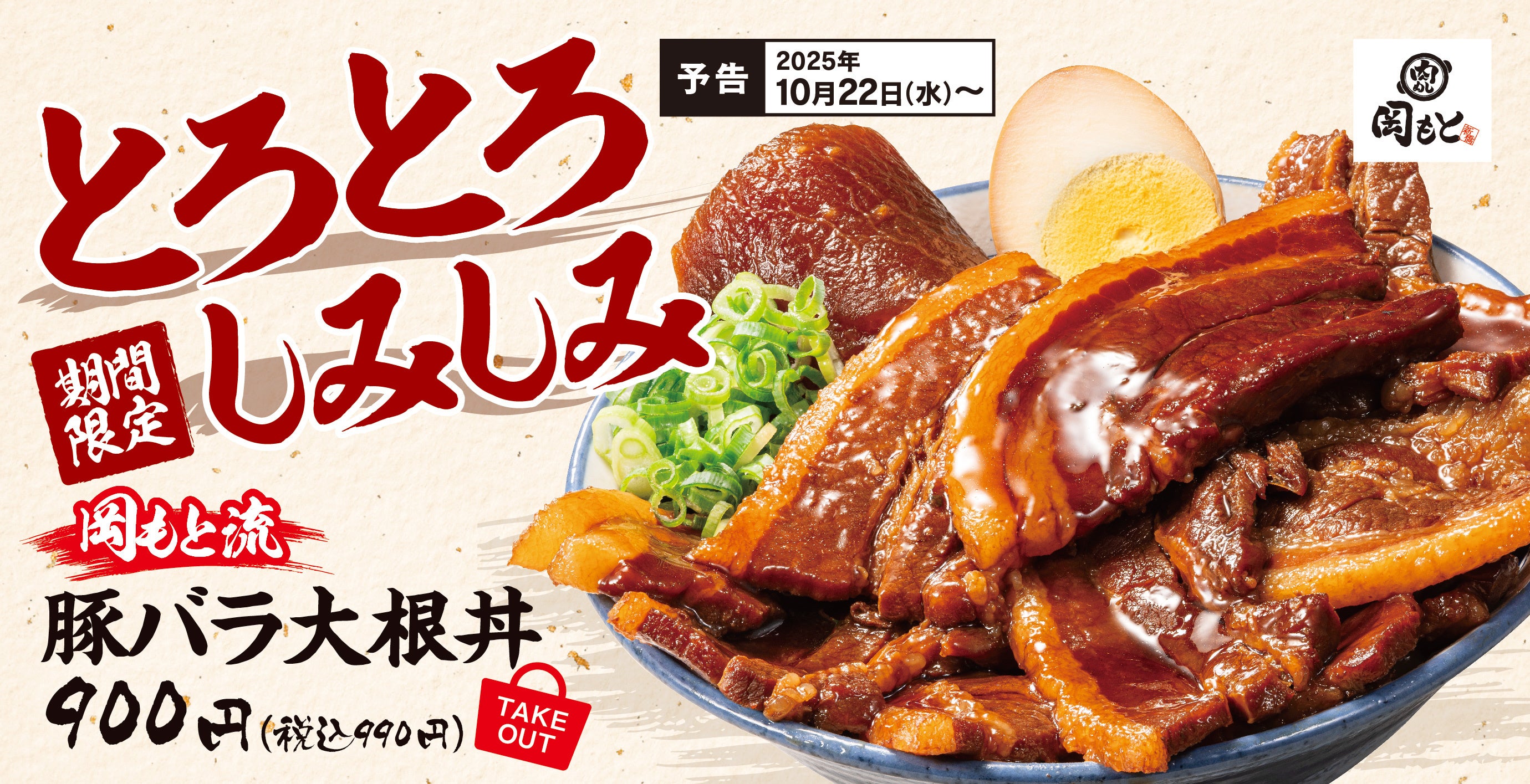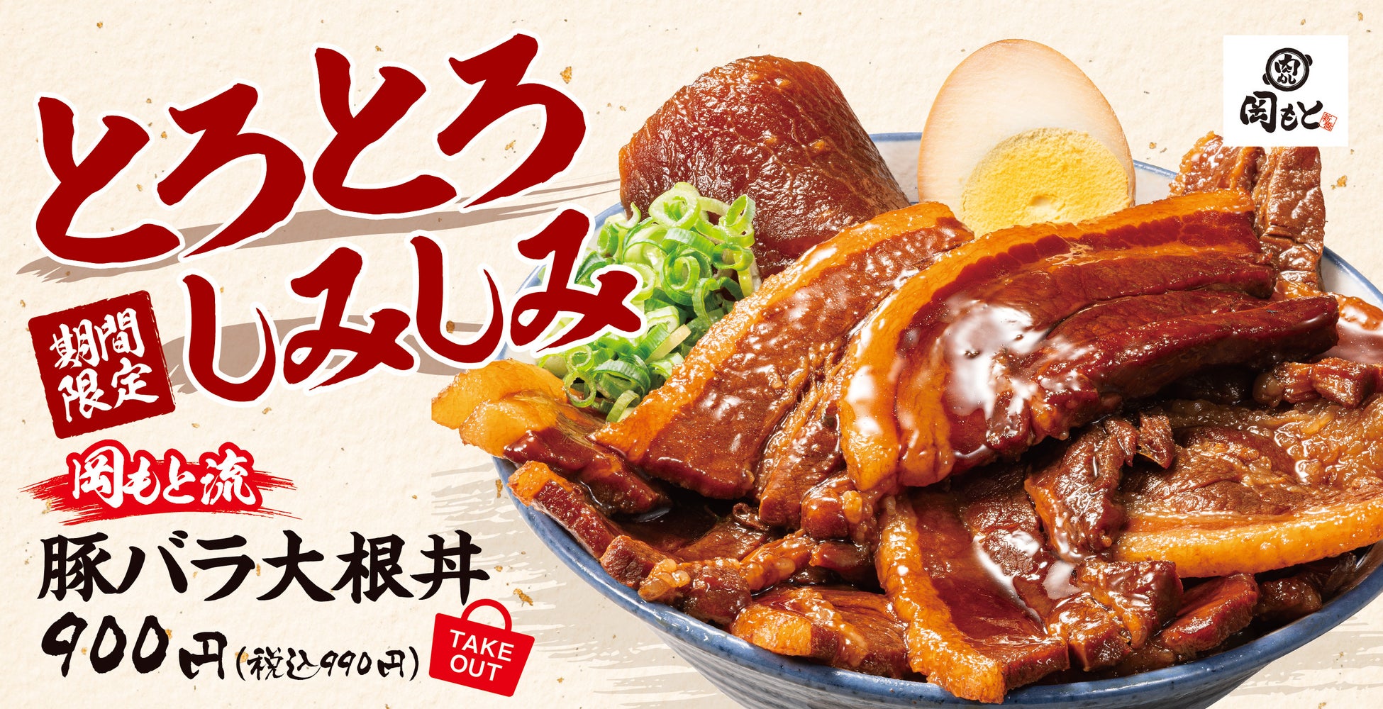 肌寒くなるこれからの季節、恋しくなるのがアツアツの煮込み。煮込みの代表「豚バラ大根」を、肉めし岡もとらしく豪快な丼に仕上げた「豚バラ大根丼」を期間限定で販売いたします。