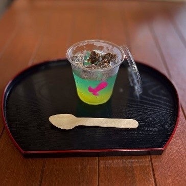 一番下はプルプル食感なくず餅、美しいブルーはコリコリ食感の檸檬寒天、