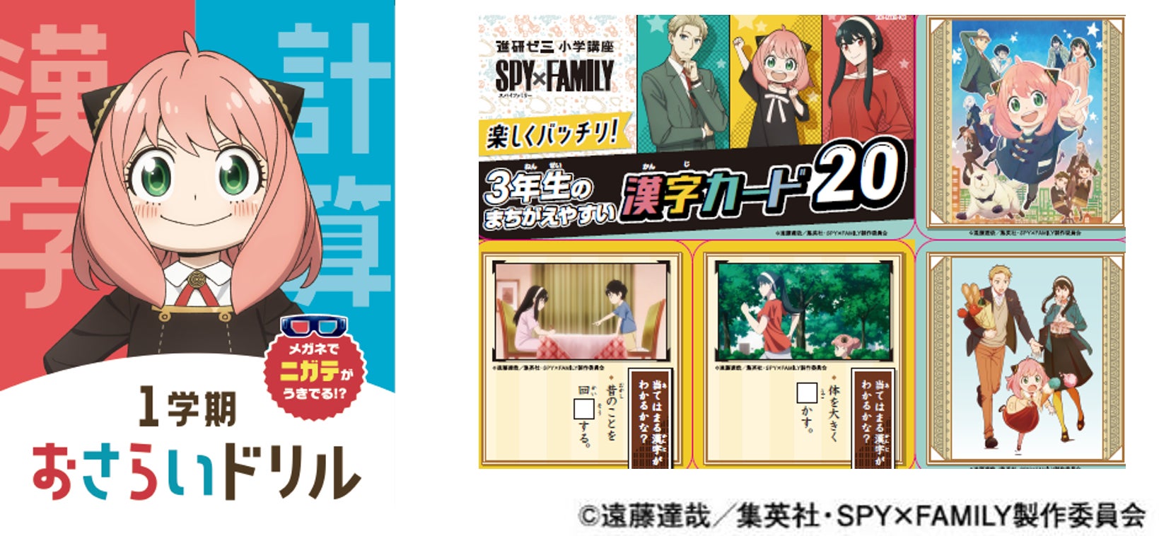 テレビアニメ「SPY×FAMILY」とコラボした漢字・計算ドリルは、1学期のつまずきやすいポイントを厳選し、苦手意識のある問題でも効率的に取り組めるほか、3Dメガネでヒントが浮かび上がる楽しい問題をご用意しています。また、同じくテレビアニメ「SPY×FAMILY」とコラボした楽しみながら覚えられる漢字カードもお届けします。