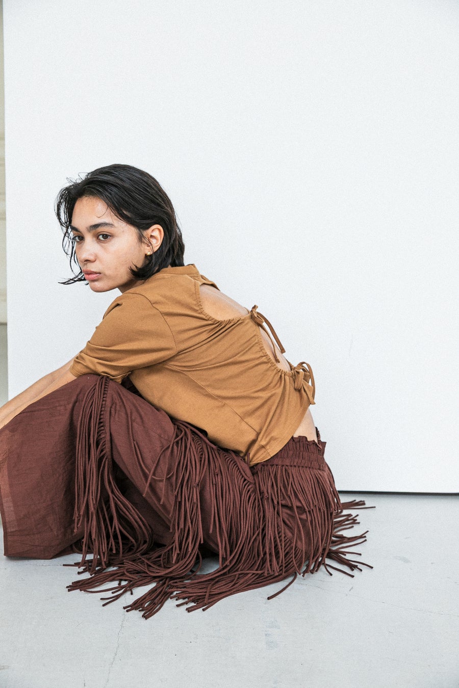 キュッと絞ってギャザーを寄せて印象を変えて着用いただけます。太めのパンツやボリュームのあるスカートと合わせてもバランス良く着ていただける一着です。