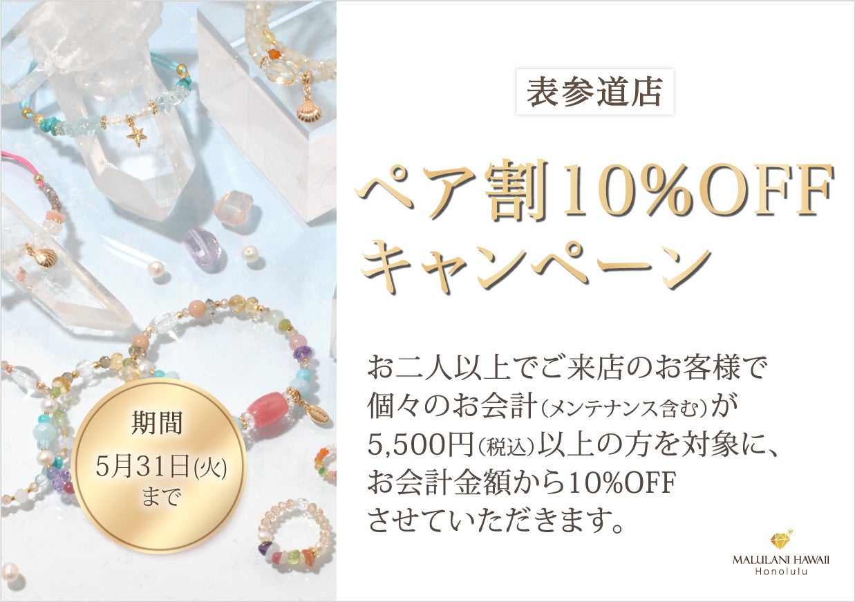 5月31日までの期間限定!【ペア割り/10%OFFキャンペーン】、ハワイ発パワーストーンアクセサリーブランド「マルラニハワイ 表参道店」にて開催いたします!