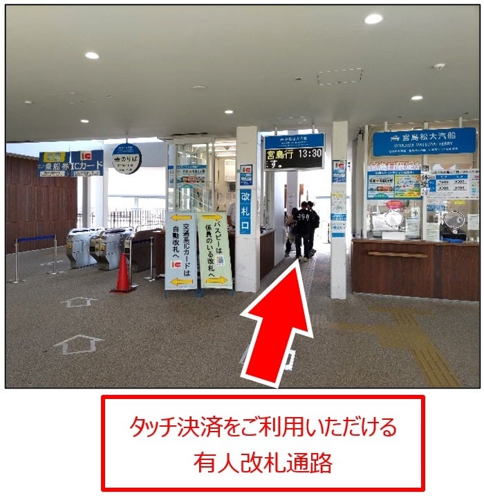 本サービスでは、お客さまがお持ちのタッチ決済対応のカードやカードが設定されたスマートフォン等を専用リーダにかざすことでご乗船いただけるようになります。これにより、世界遺産・日本三景「安芸の宮島」を訪れる観光客の方などが、券売機に並んで切符を購入することなく、スムーズにご乗船いただけるようになります。