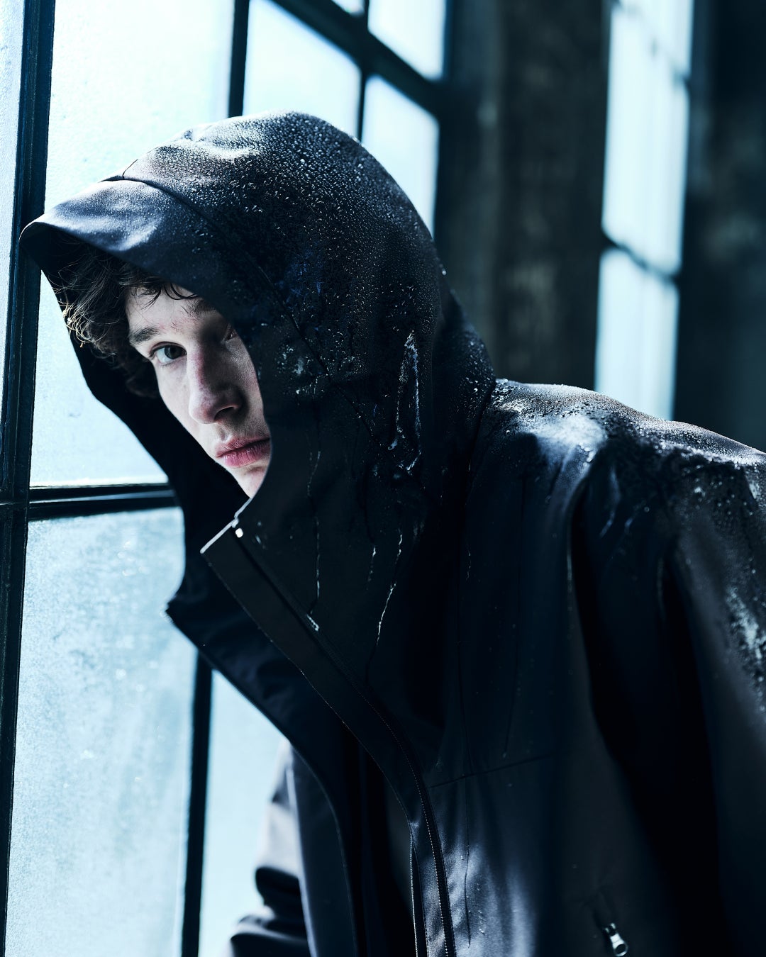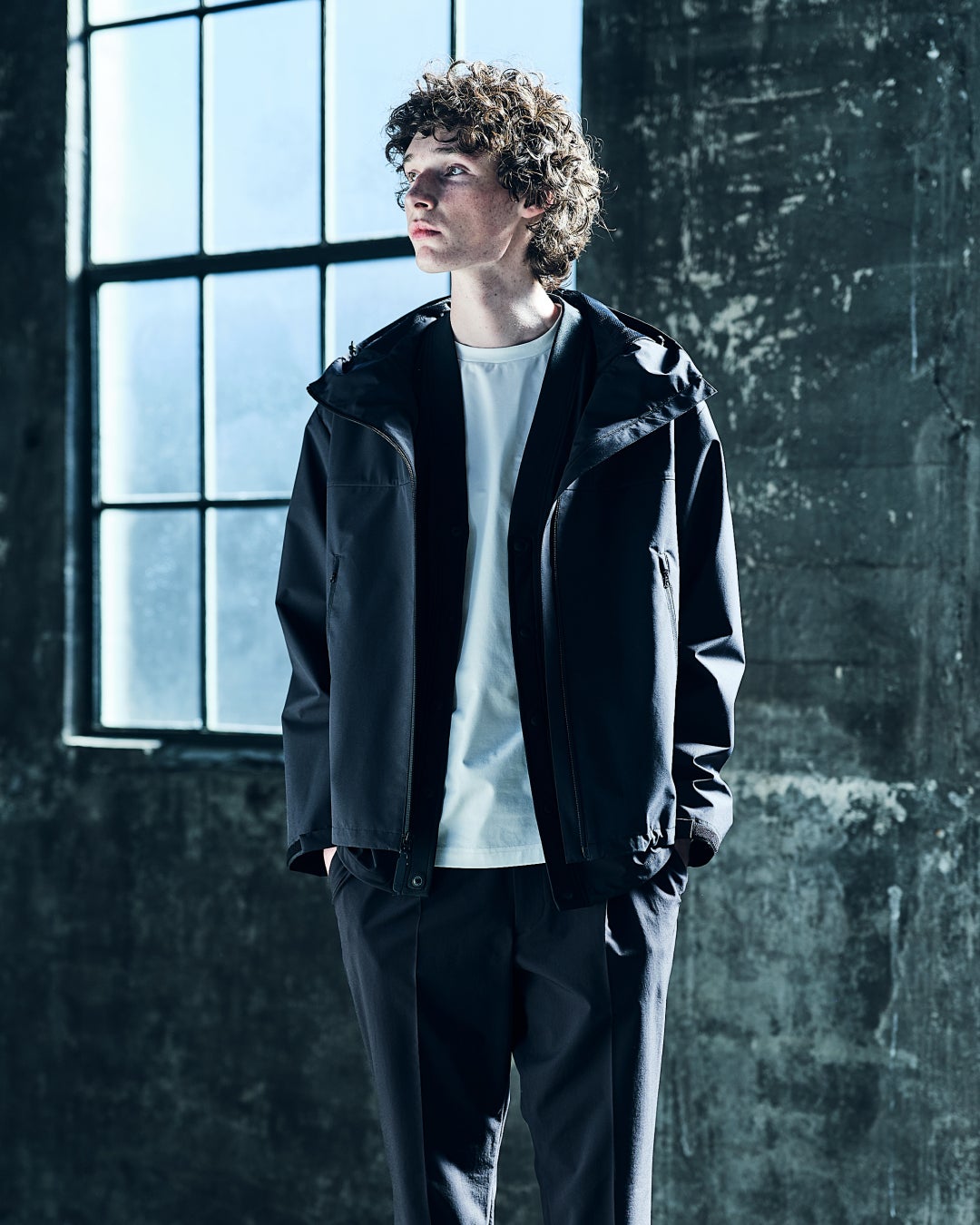 『コムサメン ブラック』は、先進的な機能素材と黒の持つ洗練美を融合させたラインです。アクティブでクール、そして実用性を兼ね備えた現代的なスタイルを提案します。この秋は日本の繊維商社である蝶理が開発したTEXBRID®で5型(ジャケット、パンツ、カーディガン、シャツ、Tシャツ)と、ドイツのsympatex®で2型(コート、ブルゾン)の計7型で、シャツとTシャツはブラックとホワイトの2色展開、他アイテムはブラックのみで展開します。