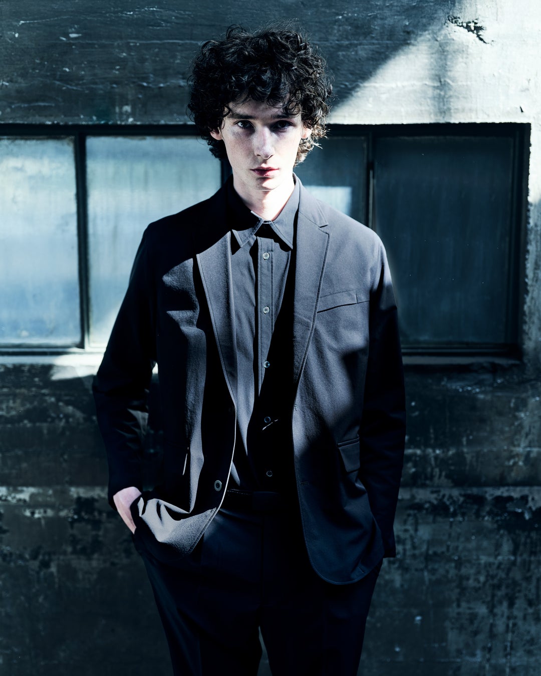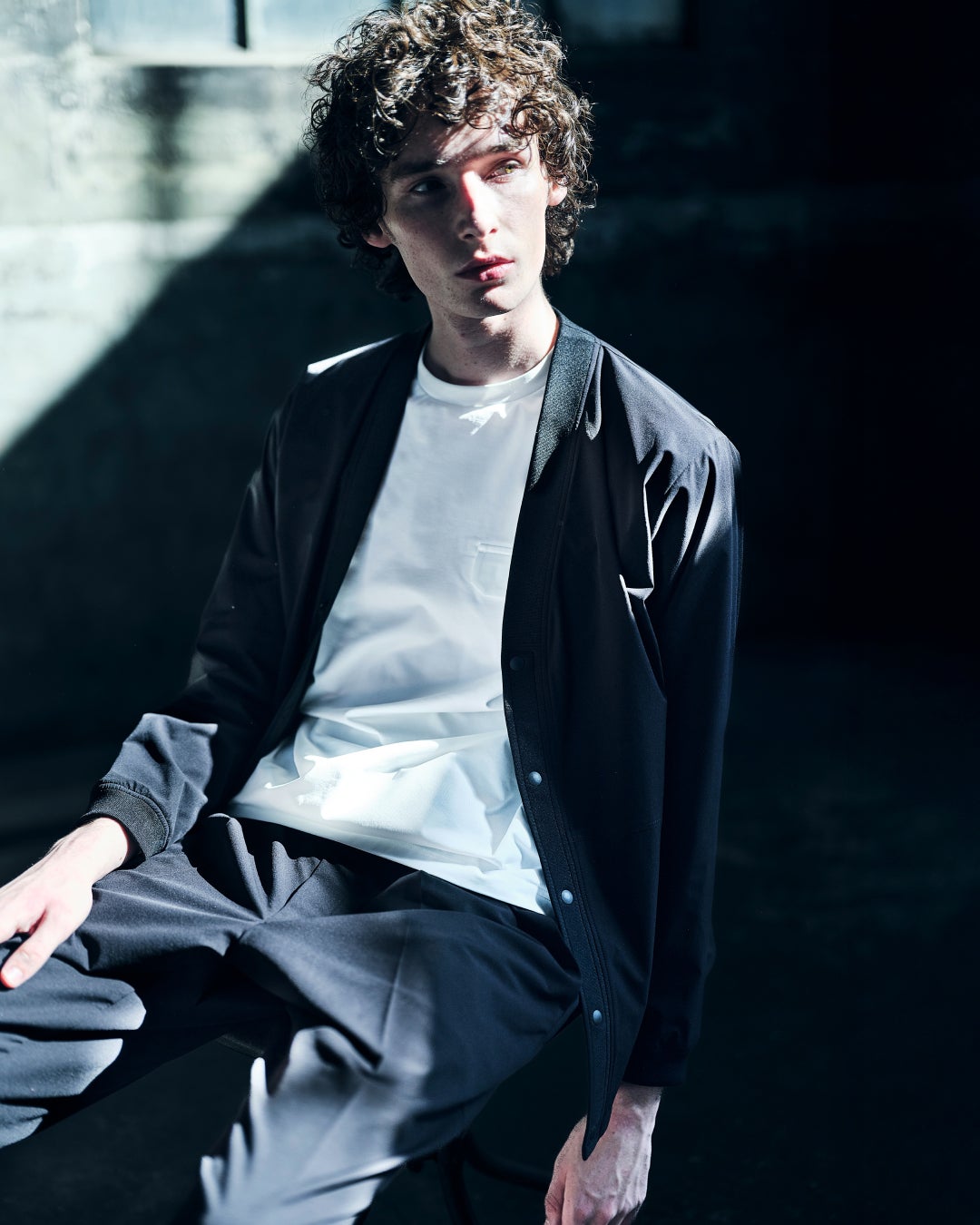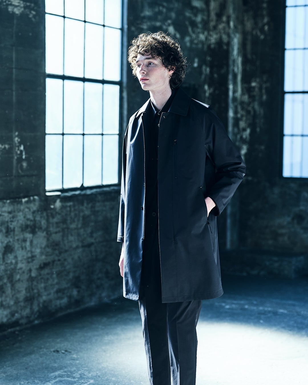 ビジネスにもカジュアルにもマルチユースに使える絶妙なシルエットを追求したジャケット&パンツ。SY加工を施すことで、合繊ながら天然素材のようなドライな表情に仕上げ、独自の表情を持たせました。