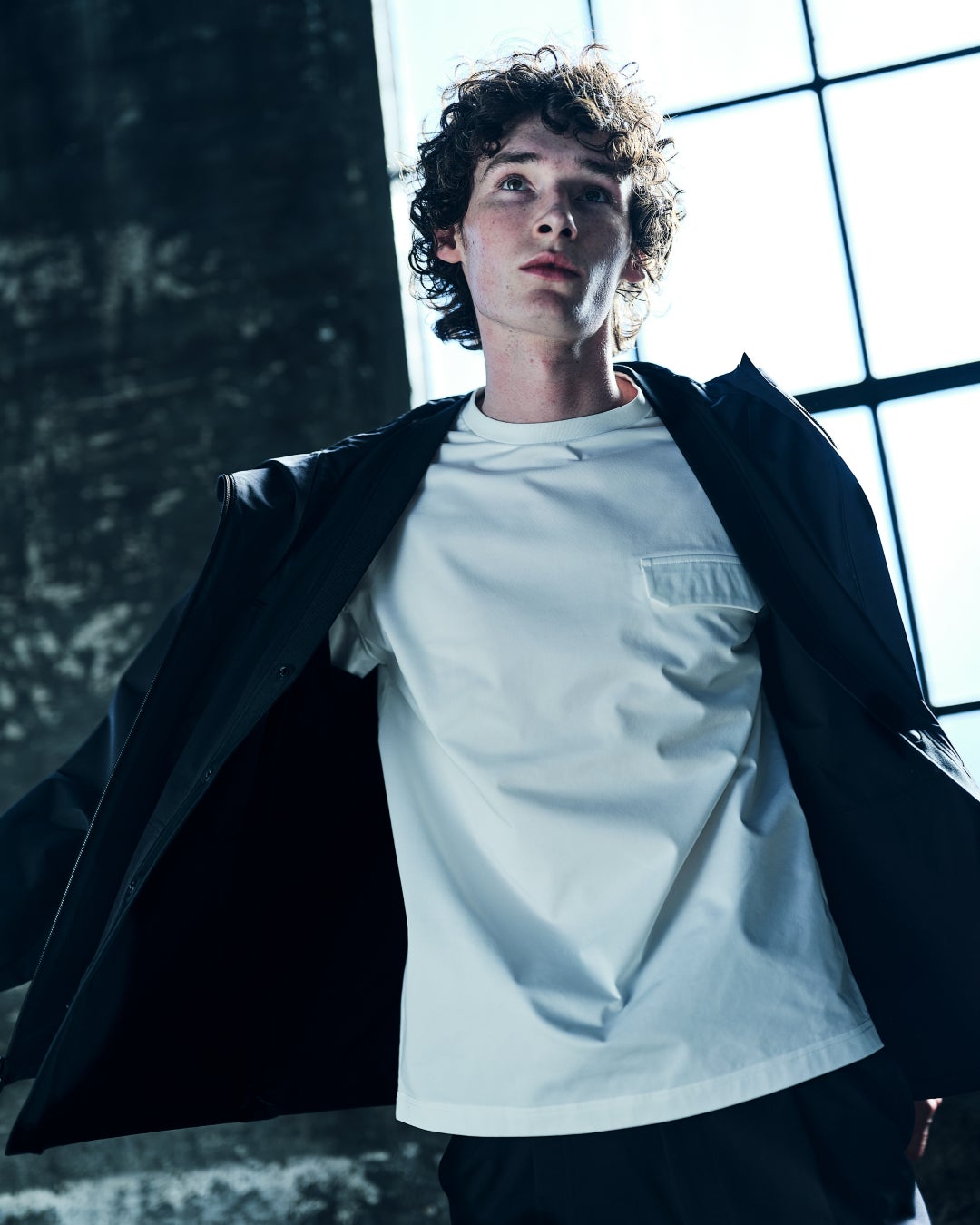 程よい張り感のあるジャージー素材。優れた吸水速乾性に加え、抗菌防臭機能も併せ持つため、快適に着続けられます。クルーネックとモックネックの間のようなハイブリッドネックで、ジャケットを羽織る際にも様になる一着。胸元にはフラップ付きポケットをあしらい、デザインポイントになっています。