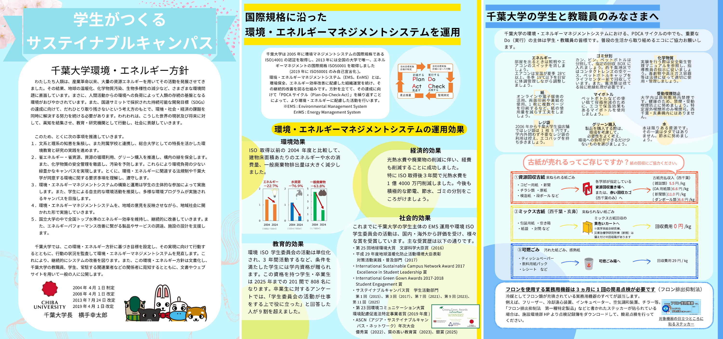 千葉大学は、環境マネジメントシステム(EMS)の国際規格であるISO14001を2005年に取得して以来、地域社会に開かれた形でEMSを運用していくことを「環境・エネルギー方針」の柱の1つとして掲げて活動をしています。千葉大学ではEMSを学生主体で運用することを教育の一環としており、2003年に設立された「千葉大学環境ISO学生委員会」が中心となって、学内・地域社会でEMSや様々な環境活動を実施しています。