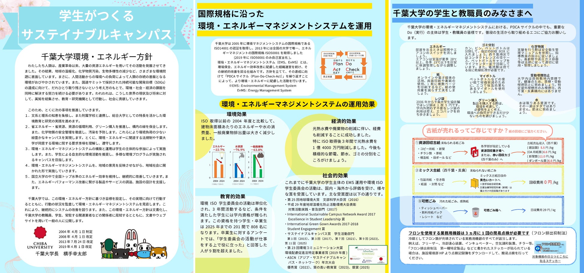千葉大学は2005年にISO14001の認証を取得しました。これに先立ち、2003年に発足した千葉大学環境ISO学生委員会は、教育の一環として環境マネジメントシステム(EMS)の運用に主体的に関わってきました。