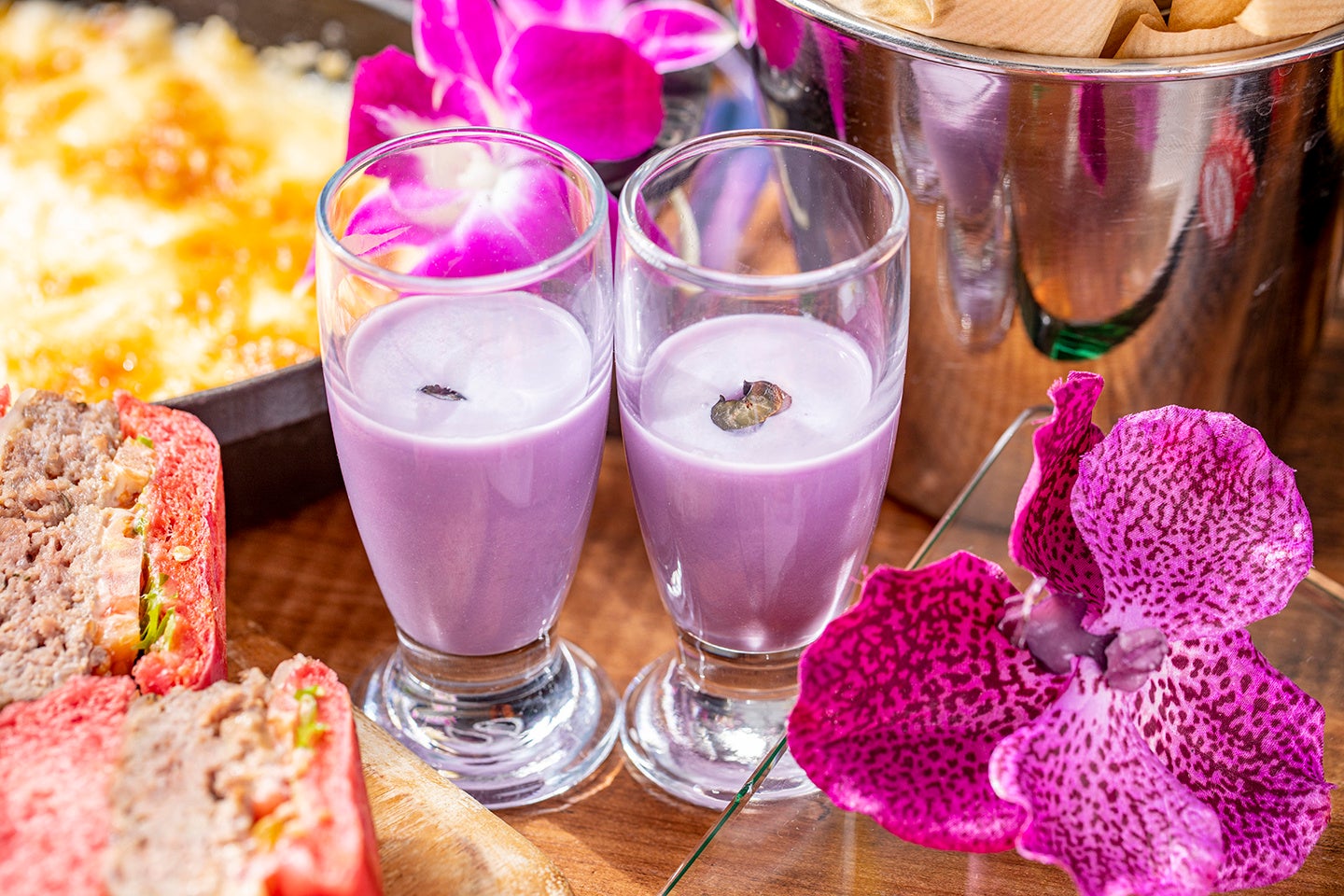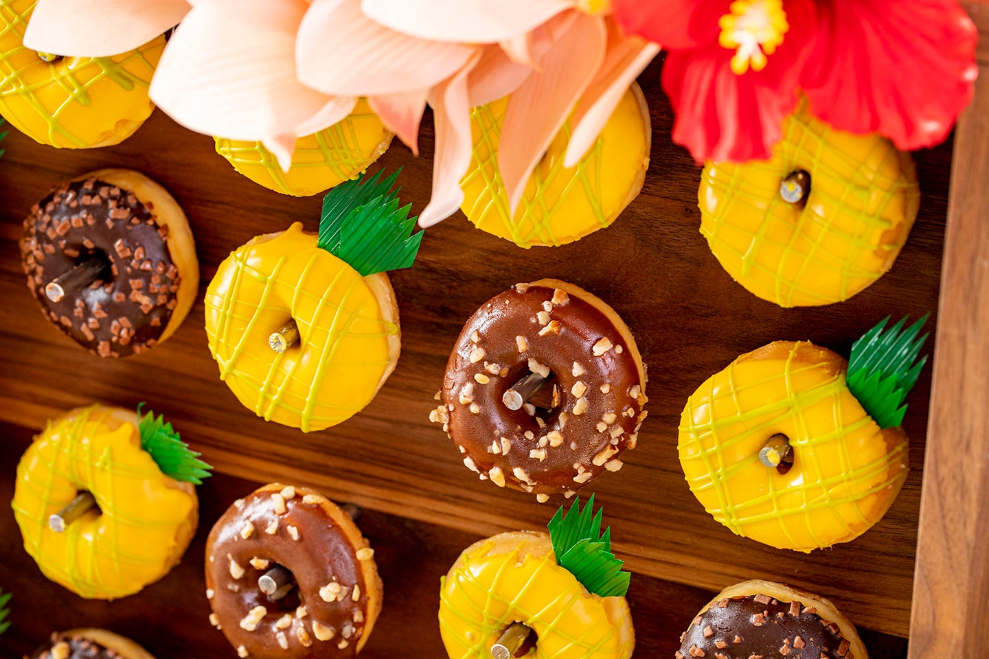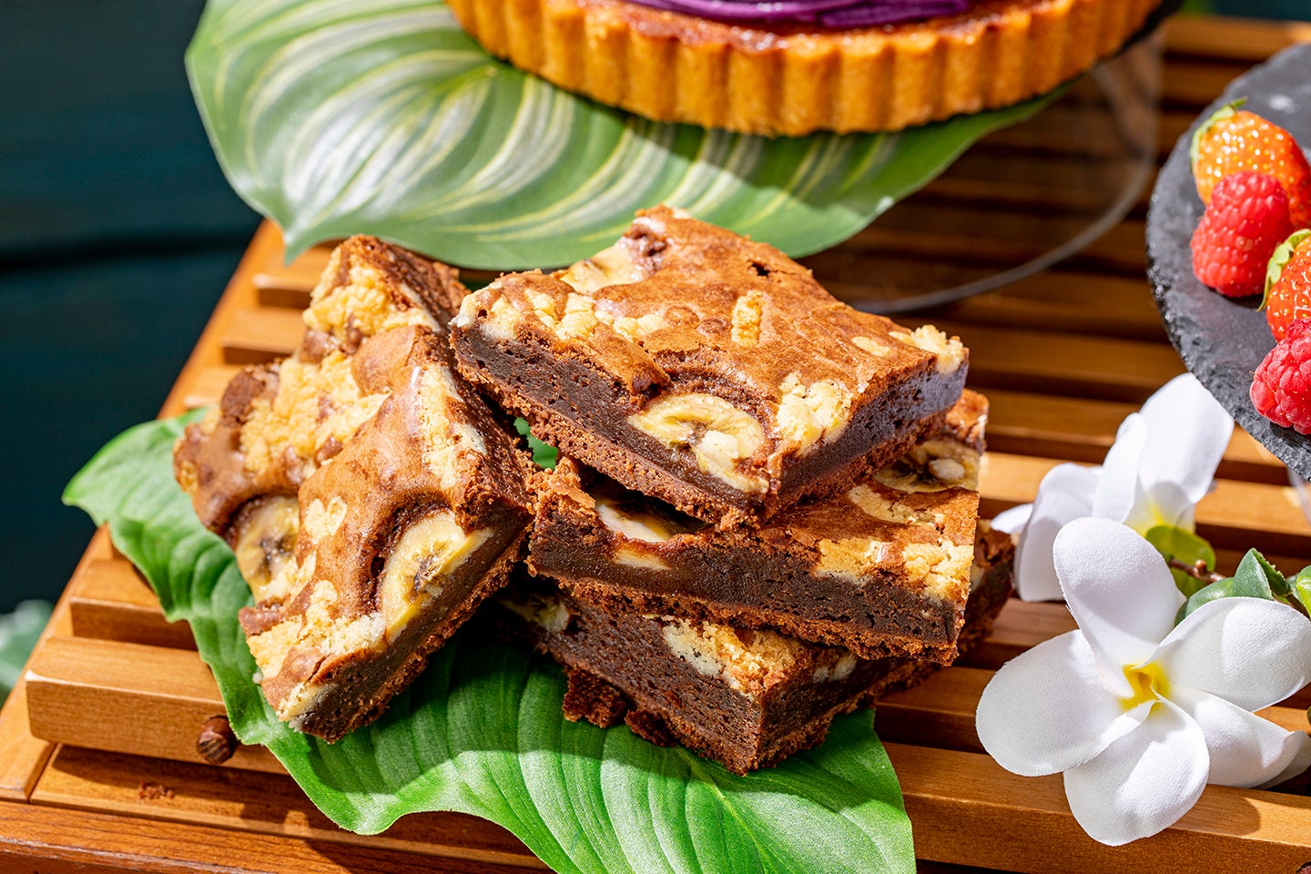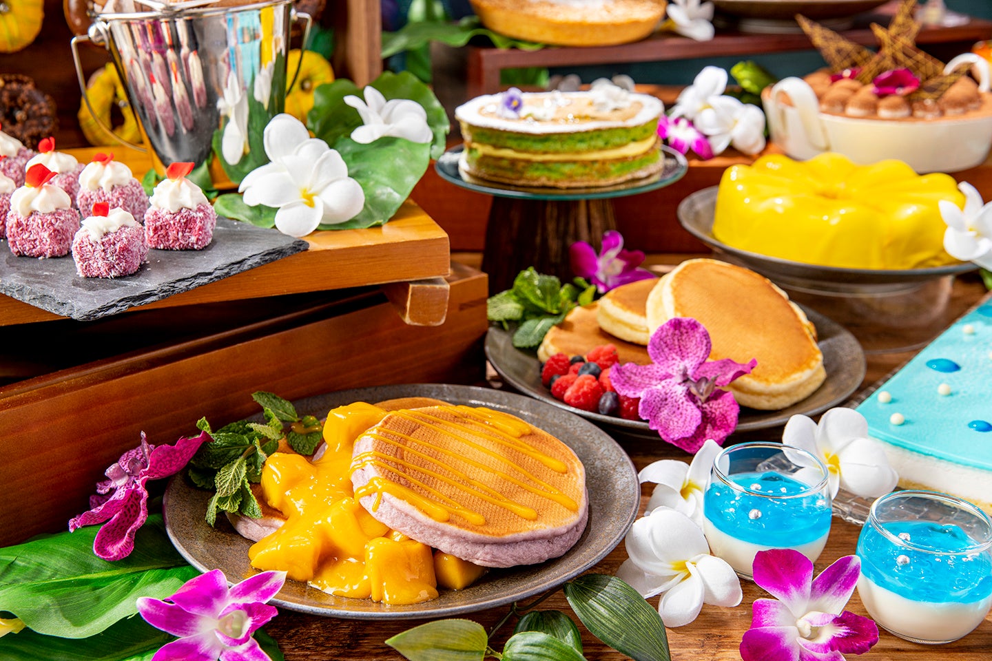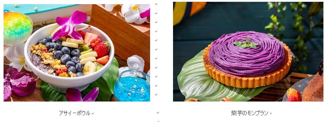 スイーツ:パイナップルムース、ココナッツムース、ダックワーズパッション、紫芋のモンブラン、クグロフショコラ“ボルケーノ”、マンゴーショート、カフェムース、ココナッツタルト、パイナップルタルト、バナナチョコブラウニー、レミントンフランボアローズ、マカダミアナッツ入りカップケーキ、マラサダ、ドーナツ、マンゴープリン、ハイビスカスジュレ、ブルーハワイジュレ