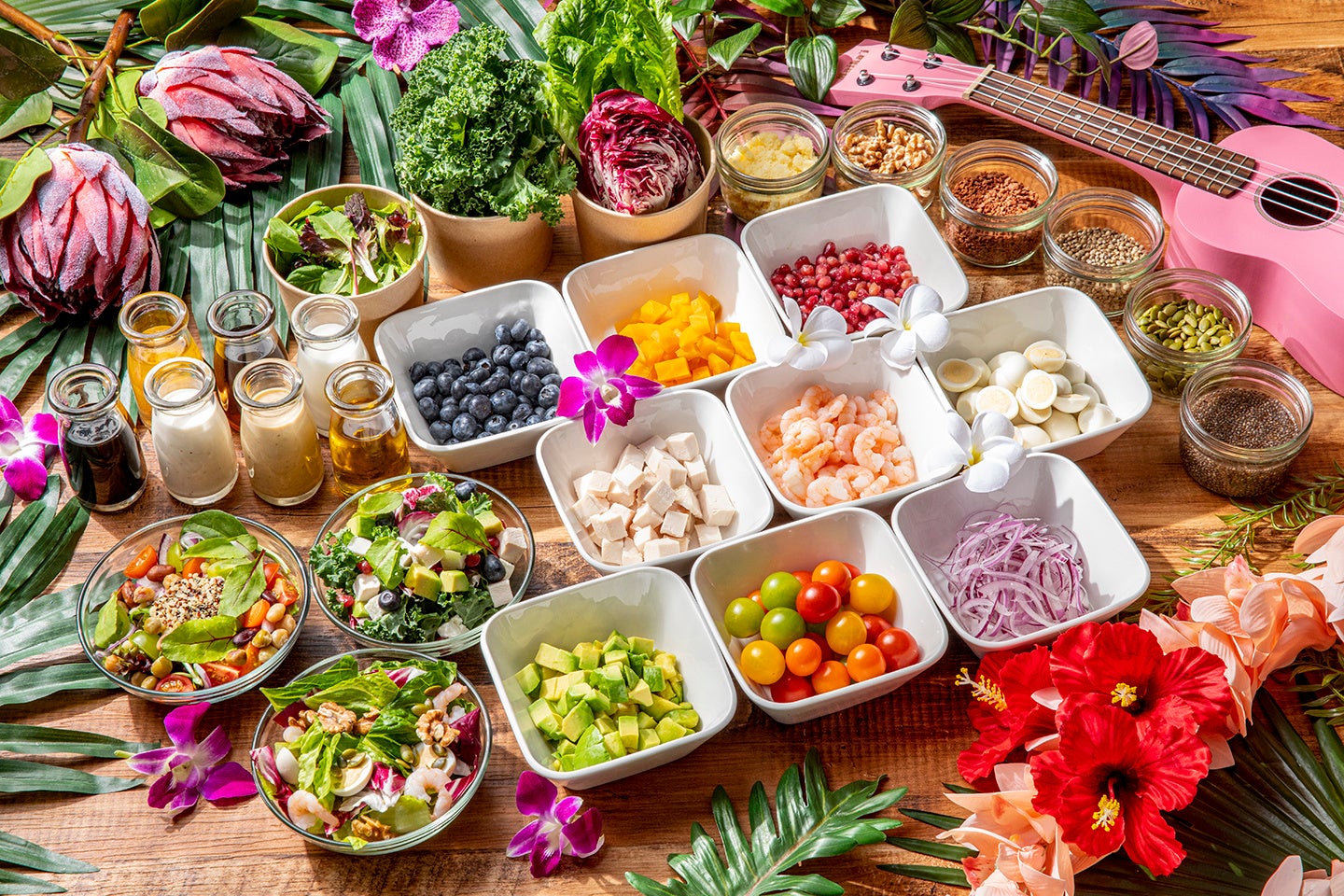 コンディメント:チキン、シュリンプ、アボカド、レッドオニオン、トマト、うずら卵、ミックスビーンズ、ゴルゴンゾーラ、フェタチーズ、キヌア、ゴールデンビーツ、ブルーベリー、ザクロ、コンキリエ、フレゴラ