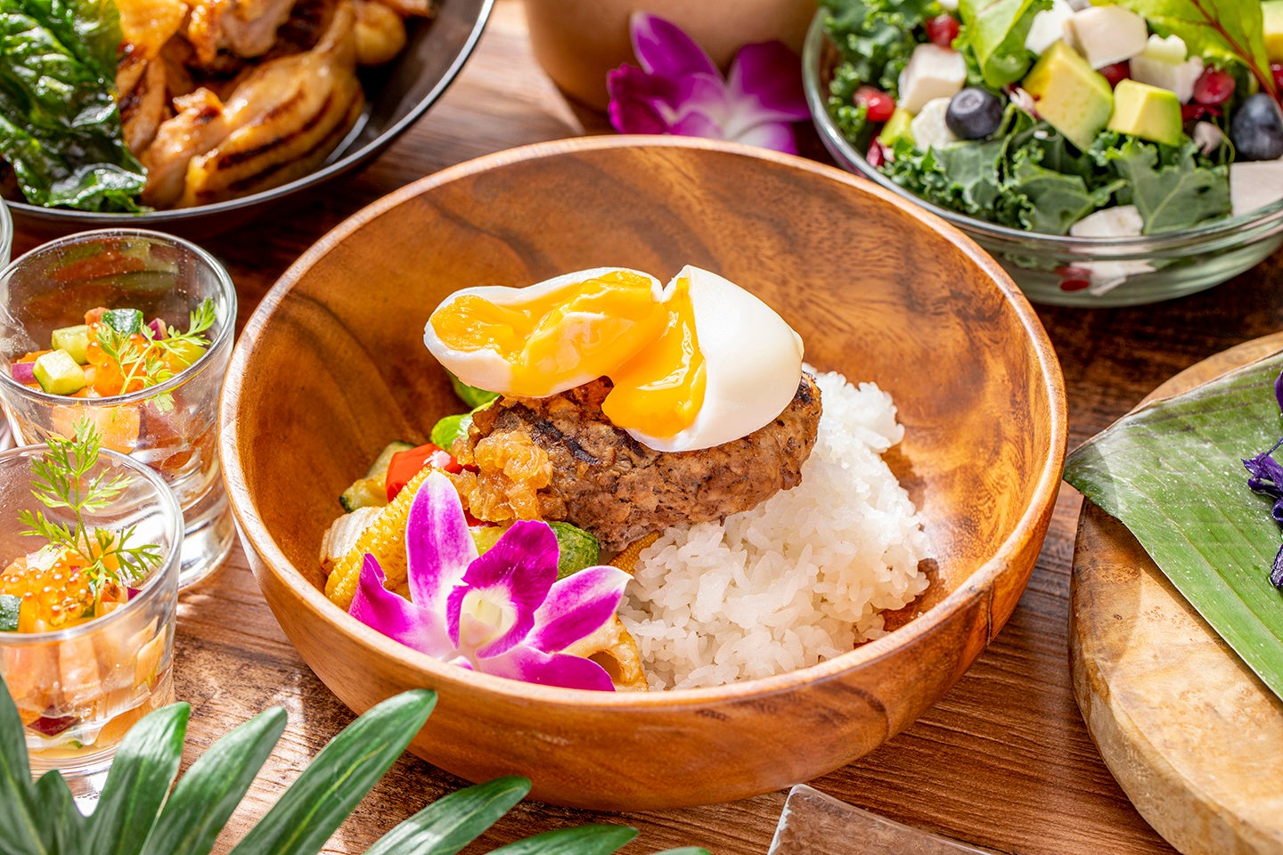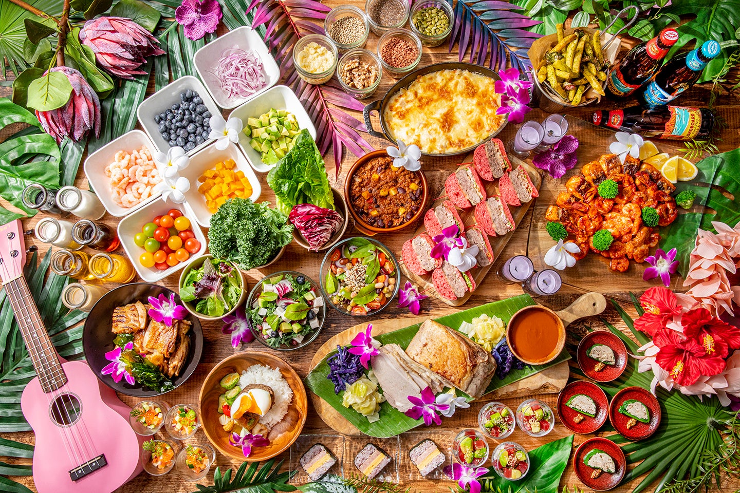ランチとディナータイムもハワイ色満載です。ハワイのロコフード、魚を小さく切るという意味の「ポキ」、「ロミロミサーモン」は、トマトとサーモンを使用したサラダ、「ラウラウ」はバナナの葉に豚肉を包んで焼き上げたお料理です。ハワイの照り焼きチキン、「フリフリチキン」、ミニハンバーグにポーチドエッグを重ね、ソースをかけた「ロコモコ風」、「ガーリックシュリンプ」、「ビーフショートリブ」などビュッフェメニューはロコフードを中心にハワイの味をめいっぱい満喫してください。