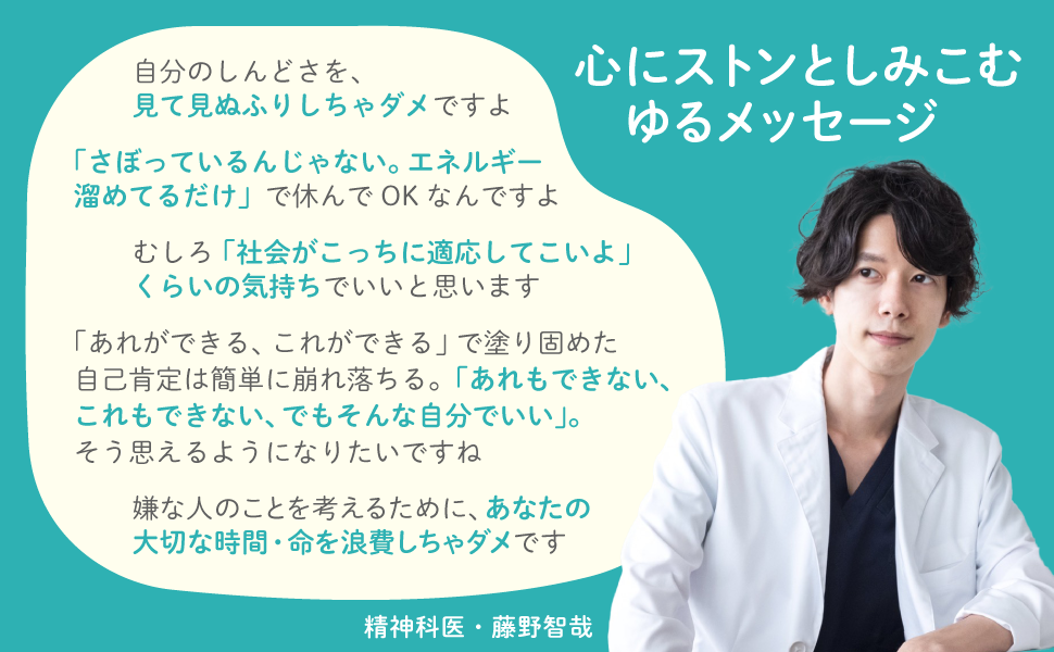 本書の著者は、「世界一受けたい授業」などテレビ番組にも多数出演している人気精神科医・藤野智哉さん。Twitterでは、精神科医としてのアドバイスに加えて、自分自身を大切にするためのメッセージを発信し、フォロワーは7万人にものぼります。