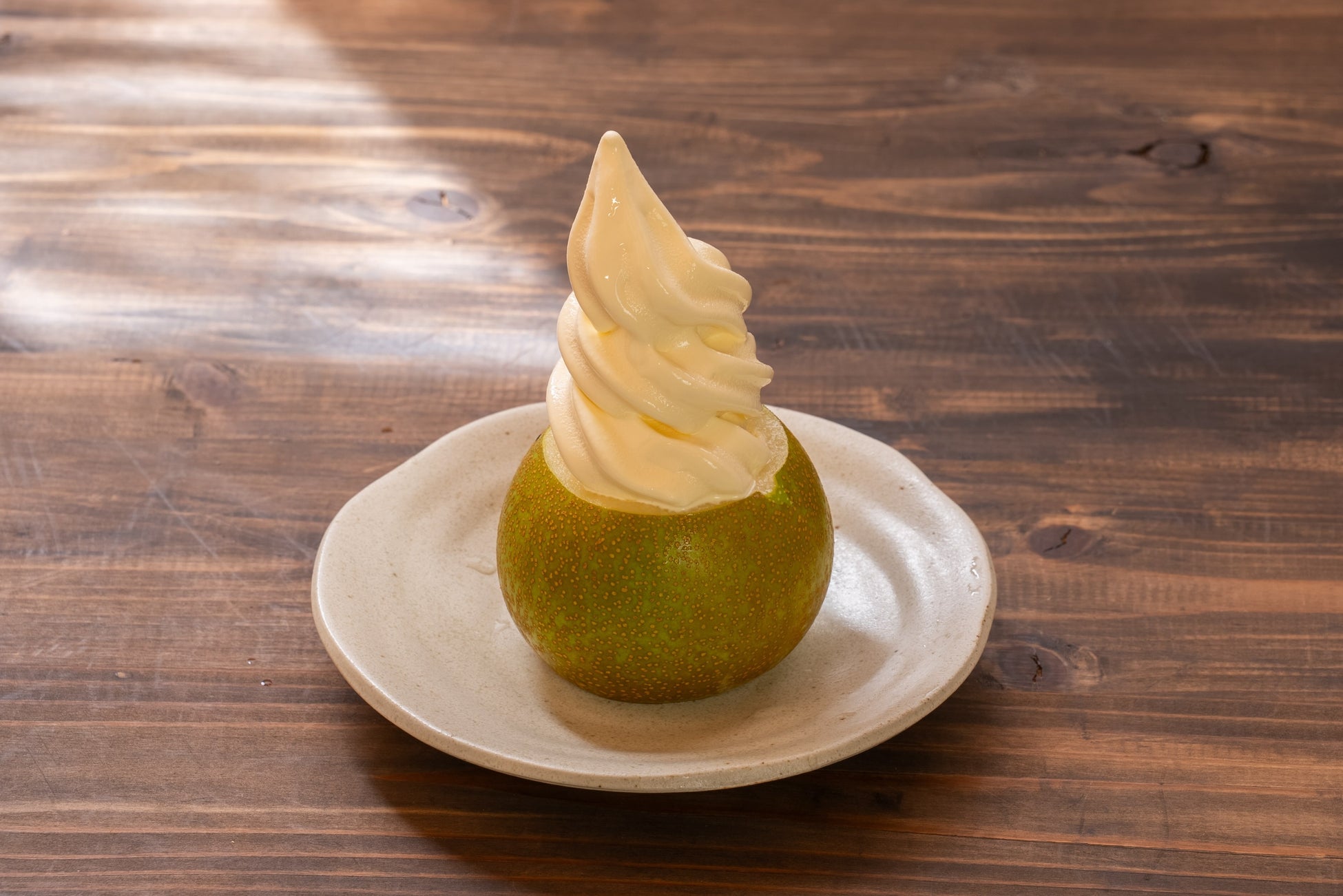 神川町産の梨を丸ごと1つ器にし、濃厚なソフトクリームを絞った贅沢デザート。