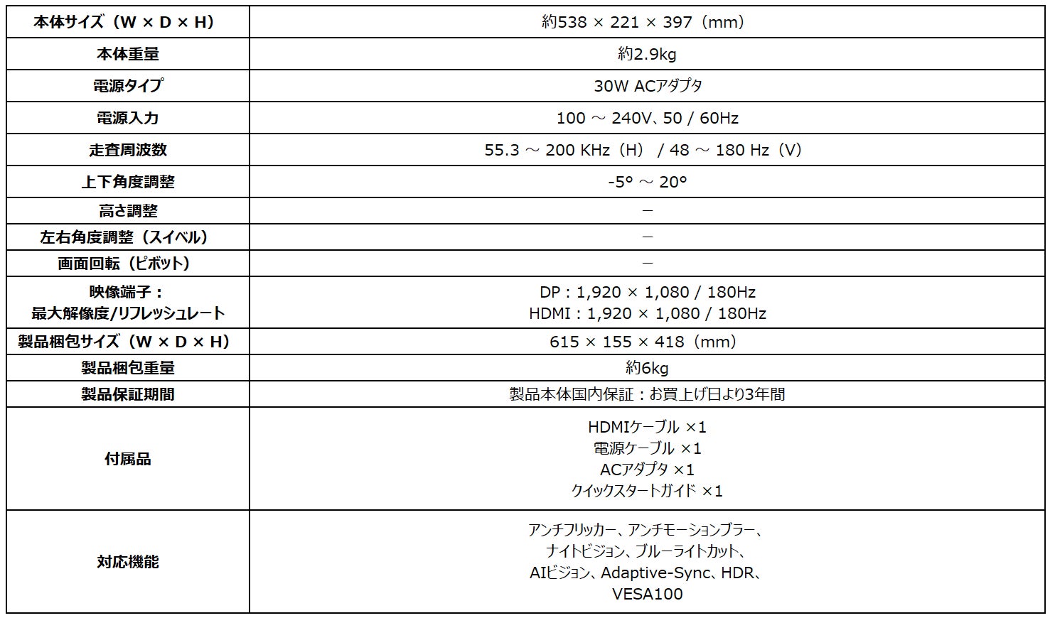 「MAG 244C」は肉眼に近い湾曲率1,500Rにより高い没入感を体験でき、手頃なサイズ感の23.6インチのフルHD(1,920 × 1,080)・180Hz・1ms(MPRT)の高いゲーミング性能を備えています。パネルには引き締まった黒の表現が得意で、高いコントラスト比が特徴のVAパネルを搭載しており、奥行きのある美しい映像が楽しめます。ゲーム向きの機能として黒挿入機能であるアンチモーションブラー、映像シーンに合わせて画面の明るさ・コントラスト・彩度を自動で調整するAIビジョン、リアルな映像表現が可能なHDR、Adaptive-Sync、次世代家庭用ゲームでの1080p/120Hz表示に対応し、ストレスフリーでゲームプレイを楽しむことができます。また、モニターアームなどに取り付け可能なVESA規格にも対応しています。