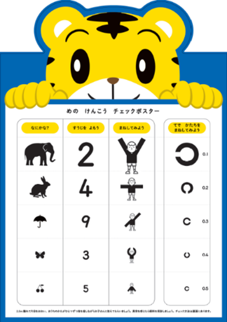 イラストや数字を見ながらクイズをしたり真似をしたりして遊ぶことができ、親子で楽しく視力検査に取り組んでいただけるポスターです。