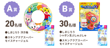 抽選で合計100名に、しまじろうの外遊びグッズとロート製薬の日焼け止めをプレゼントいたします。