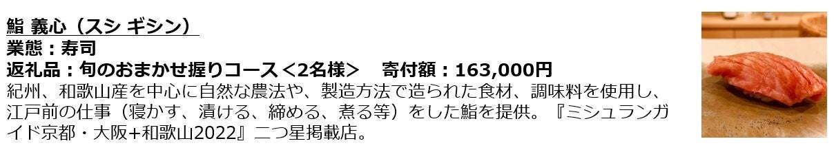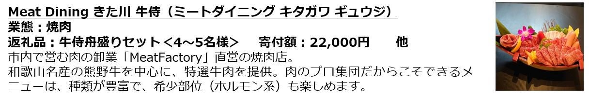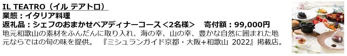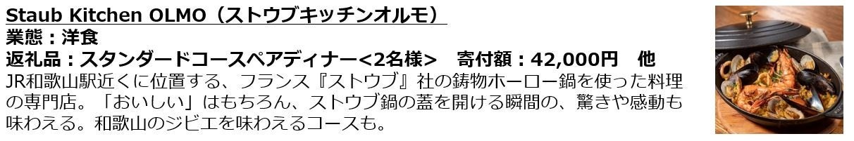 本取り組みには、和歌山市の『ミシュランガイド京都・大阪+和歌山 2022』に掲載されている飲食店や地元の人気店が参画し、主に大阪・京都・兵庫など近隣エリアから、休日を利用して訪れるお客様などに向け、返礼品として和歌山市の産品を活用した料理を中心に提供します。また、シェフと一緒に漁港で食材仕入れを体験した後に味わうことができる「ガストロノミー体験型のコース料理」など独自の返礼品も展開します。