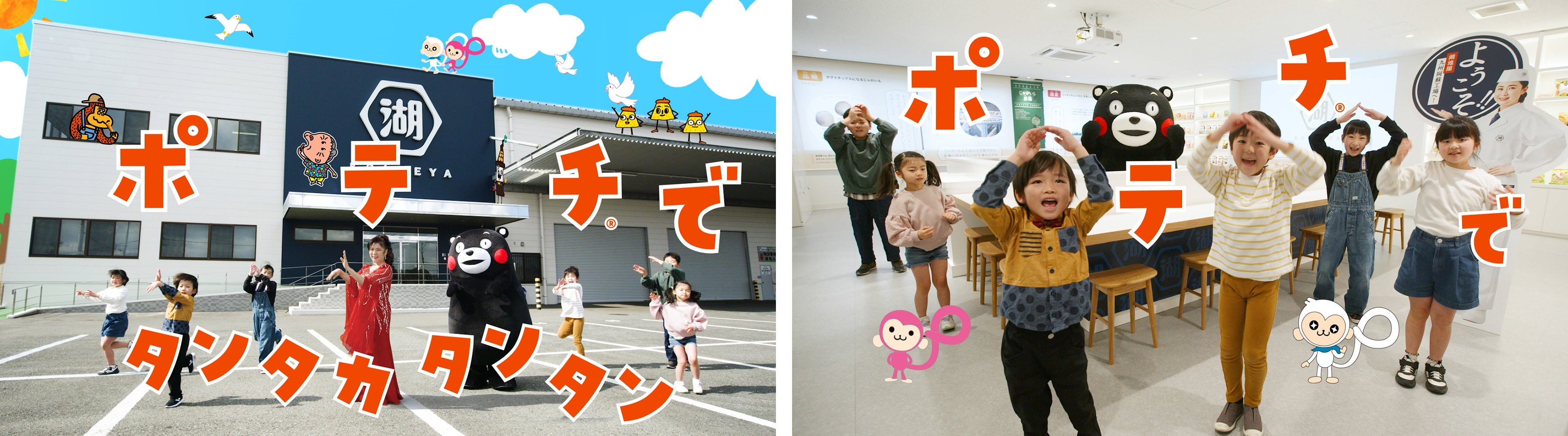 TVCMに収まりきらない部分もMVにはたっぷり収録されており、八代亜紀さんをはじめ、熊本県営業部長兼幸せ部長“くまモン”、熊本県出身のプロゴルファーであり、湖池屋 九州阿蘇工場アンバサダーである古閑美保さんの他、熊本を代表する観光地をバックに九州阿蘇工場の地元・益城町の子どもたちや九州阿蘇工場の社員たちが楽しいダンスを披露しています。