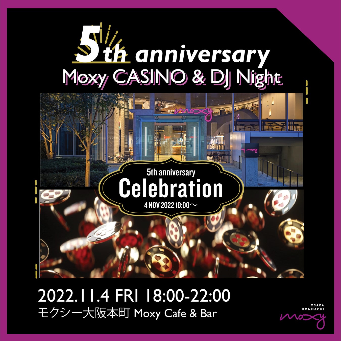 記念すべき5周年をお祝いするため、11月4日(金)には「5th anniversary Moxy CASINO & DJ Night」を開催します。当日は、ルーレット・バカラ・ブラックジャックなどを楽しめるカジノアトラクションブースを設置。DJの音楽やお酒と一緒に、カジノ体験をお楽しみください。一緒に素敵な一夜を過ごしましょう!