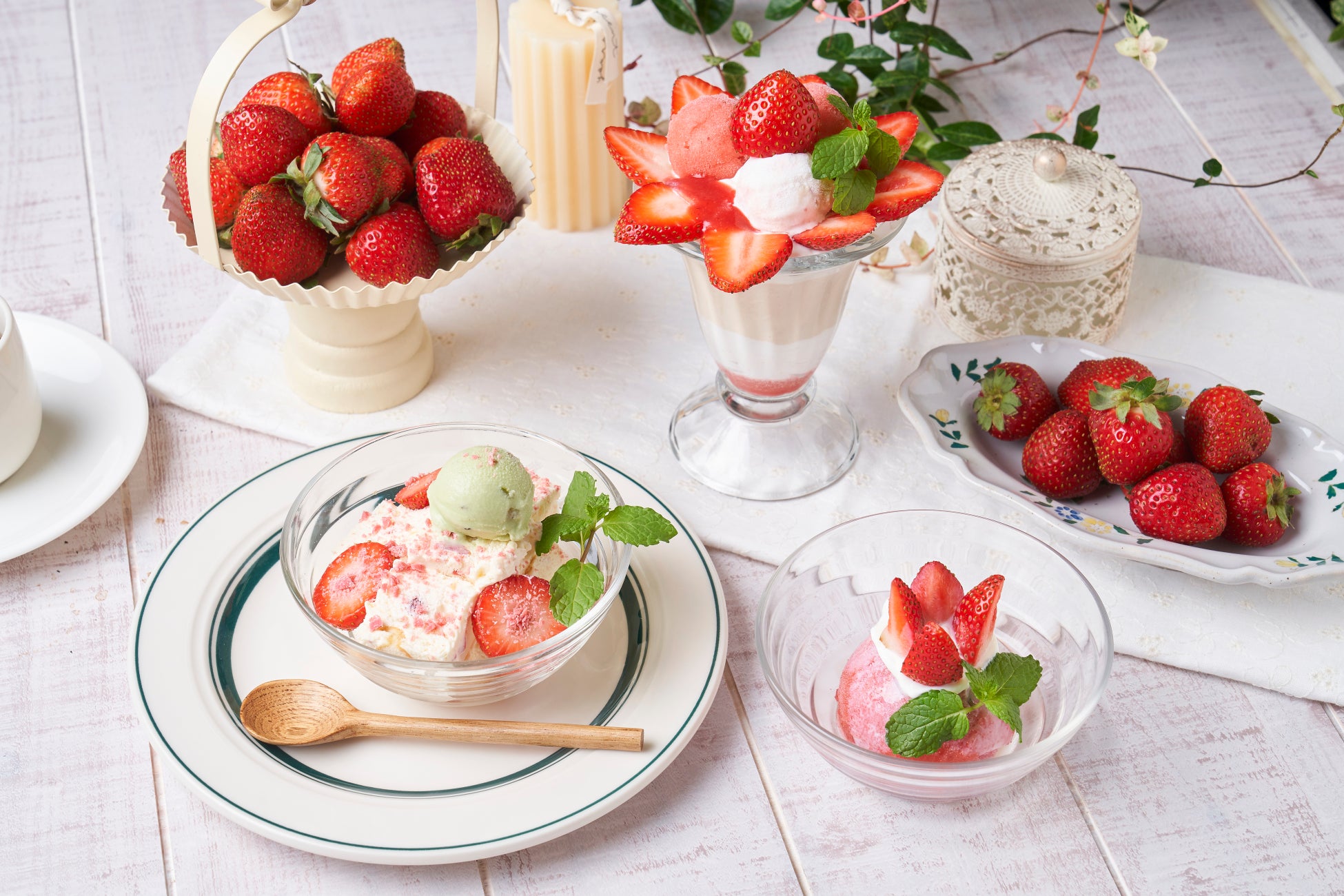「2種の苺アイスと紅茶パンナコッタの華やかパフェ」