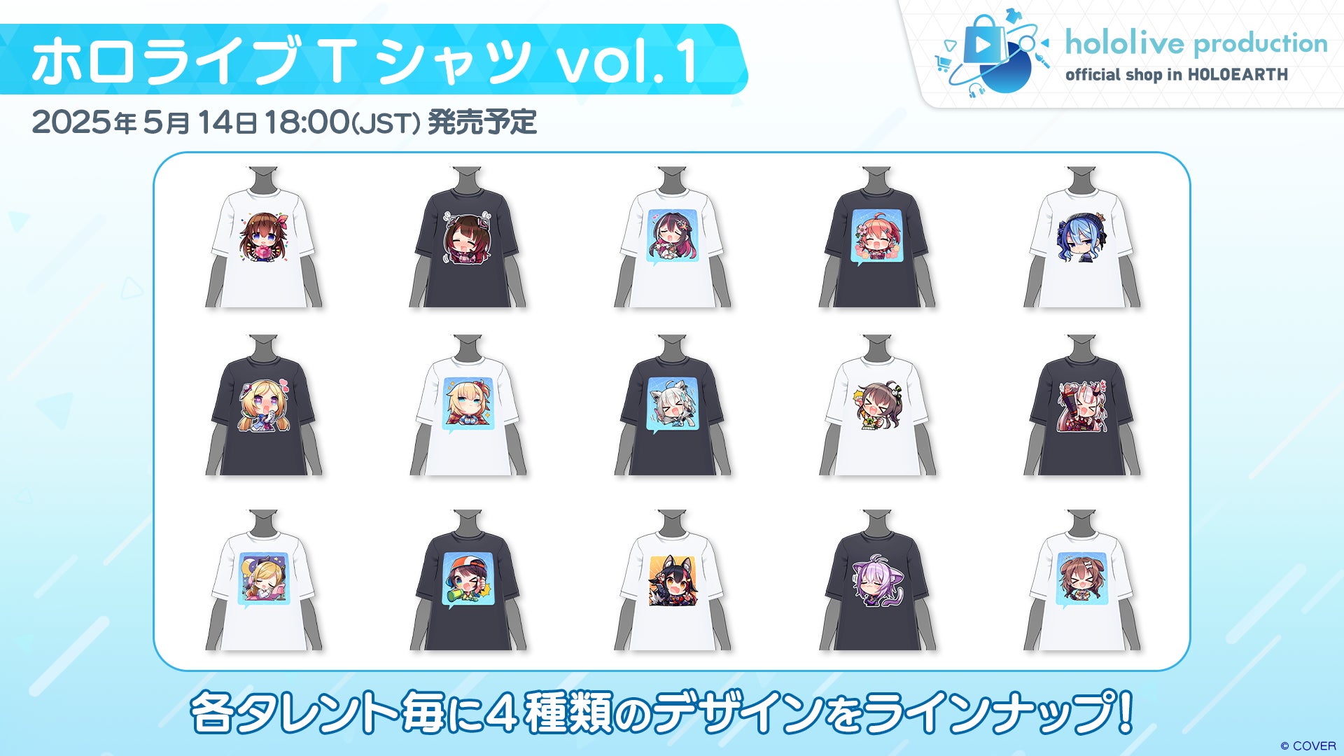 各タレントのイラストがプリントされたTシャツを全15種類販売します。