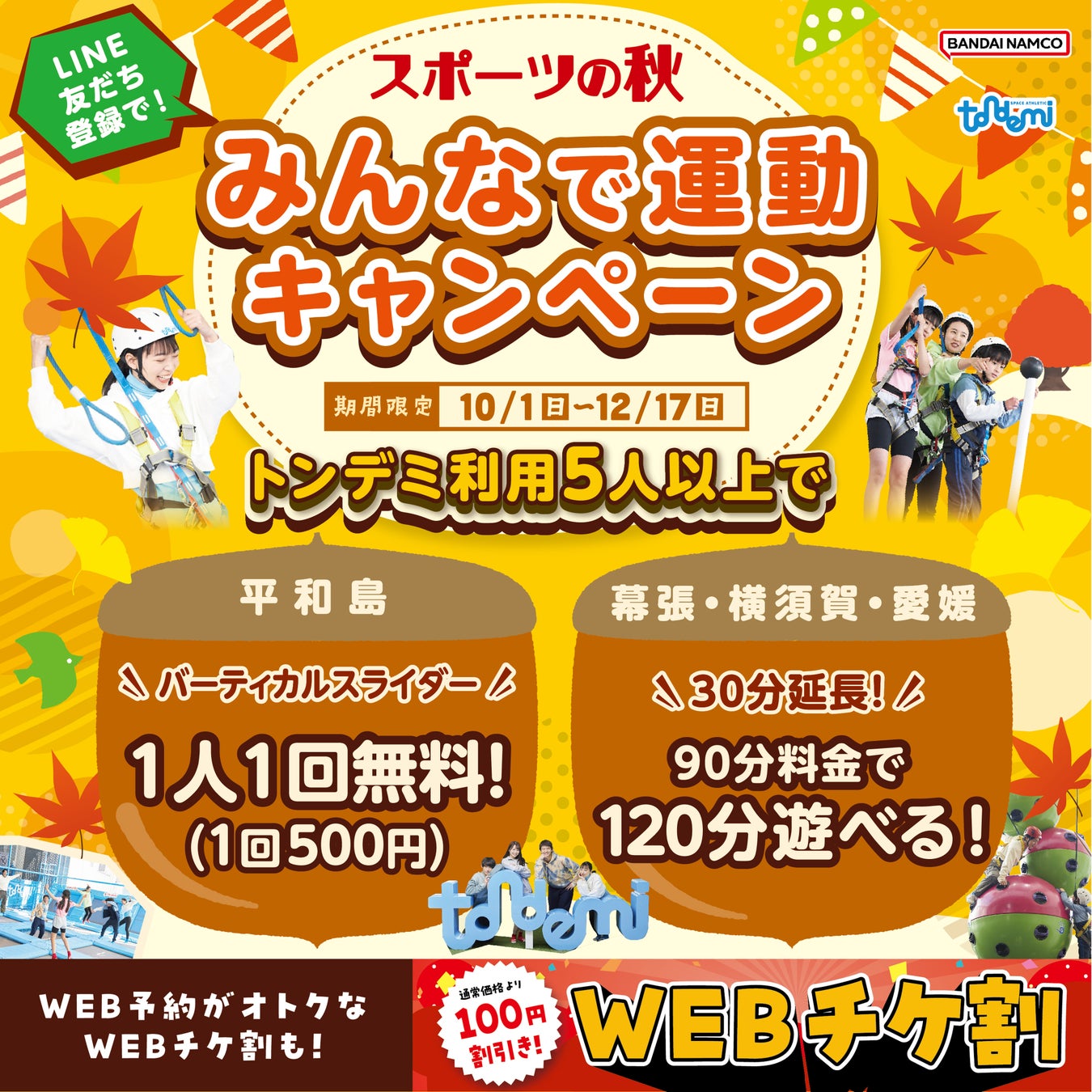 株式会社バンダイナムコアミューズメントは、全国の屋内アスレチック施設『トンデミ』にて、2023年10月1日(日)~12月17日(日)の期間中、「スポーツの秋 みんなで運動キャンペーン」と、「ごほうび割」の2大キャンペーンを実施します。