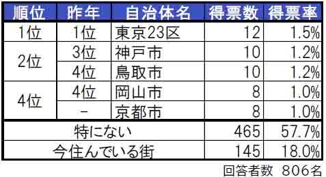 住みたい街の1位は2年連続で東京23区。2位は同率タイで神戸市と鳥取市。