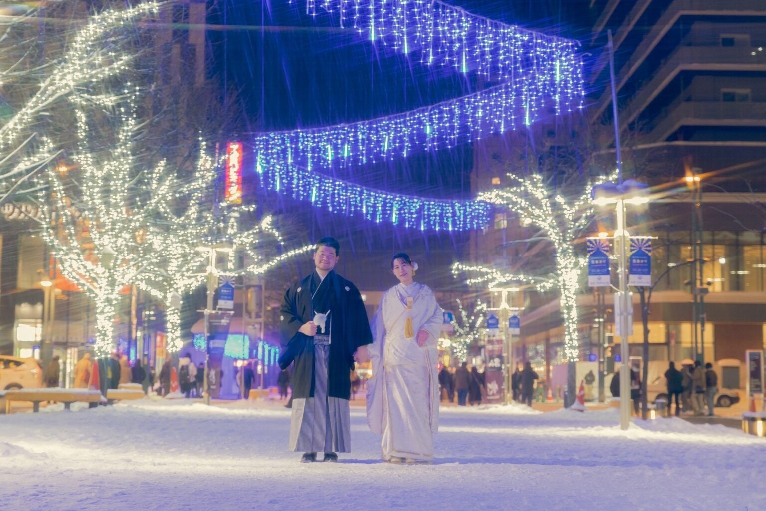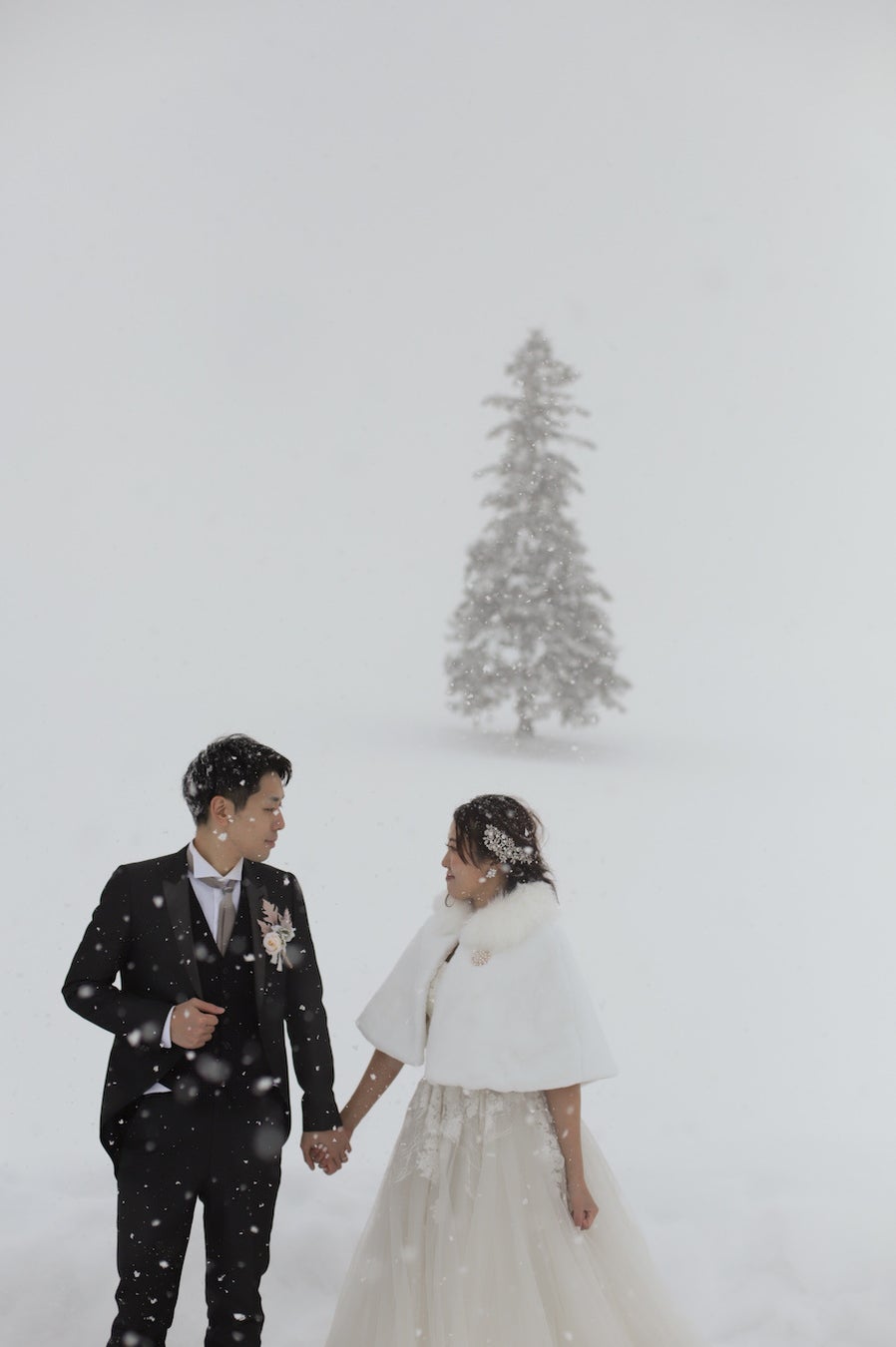 カップルにおすすめの体験はロケーションフォトウエディング。一面の銀世界に映える白無垢や色打掛、純白のウェディングドレスは、まるで絵画のような特別な一枚を創り出します。