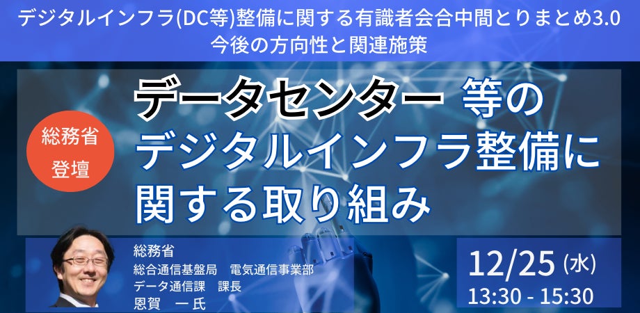 JPI(日本計画研究所)は、総務省 総合通信基盤局 電気通信事業部 データ通信課 課長 恩賀 一 氏を招聘し、データセンター等のデジタルインフラ整備に関する総務省の取り組みについて詳説いただくセミナーを開催します。
