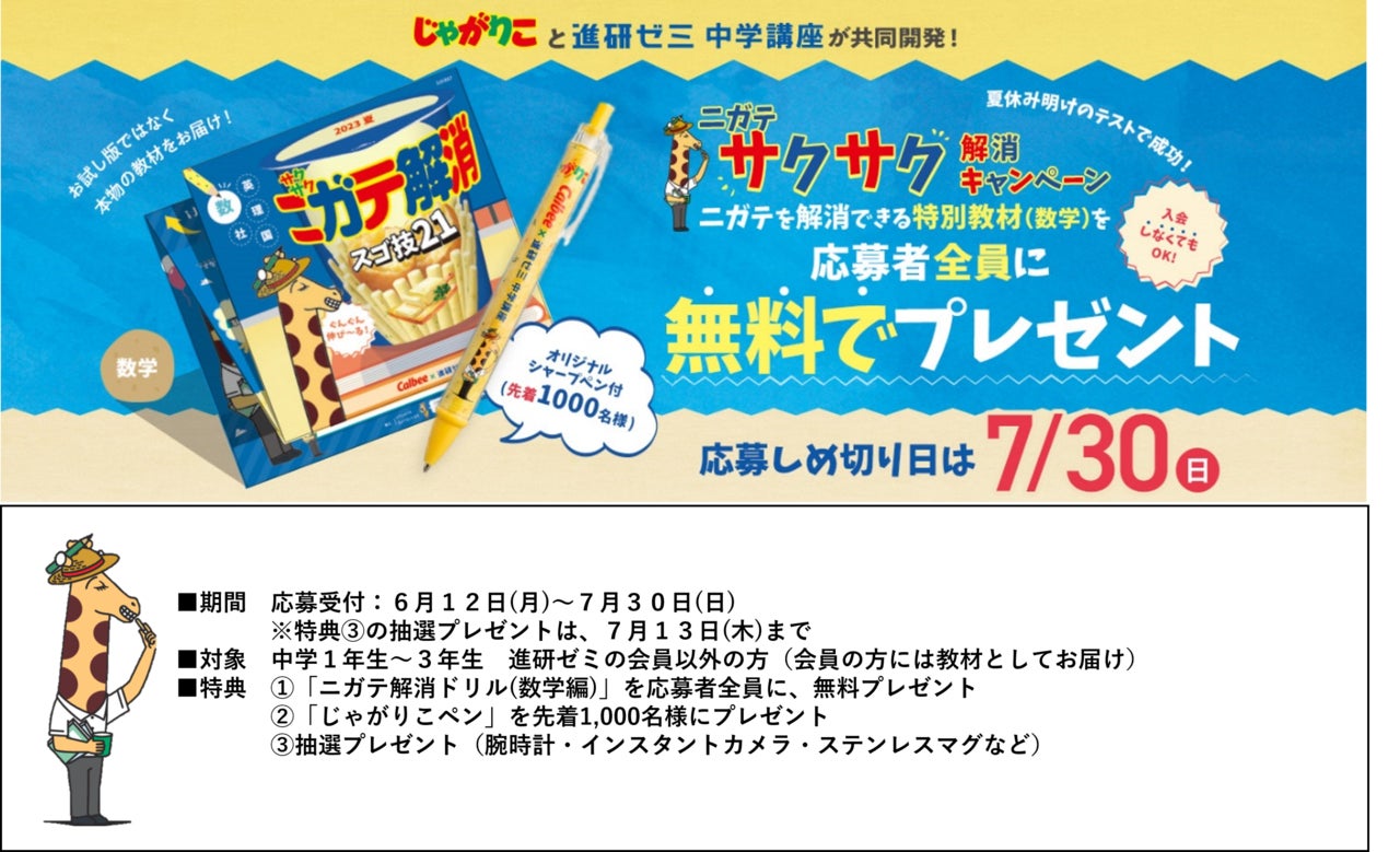 「進研ゼミ中学講座」と「じゃがりこ」のコラボレーションで夏の学習を応援 応募者全員に”サクサク”ニガテ解消ドリルを無料プレゼント