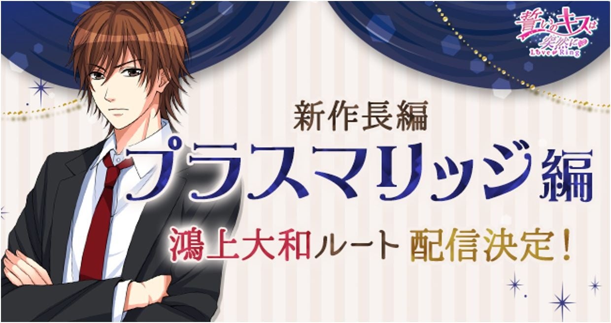 第一弾では、物理教師・鴻上大和ルートを配信。ストーリー内では新たなキャラクターも登場し、これまでとはひと味違う誓キスLRをお届けいたします。プラスマリッジ編で大好きなカレともう一度出会い、そして新たに始まる恋をお楽しみください。