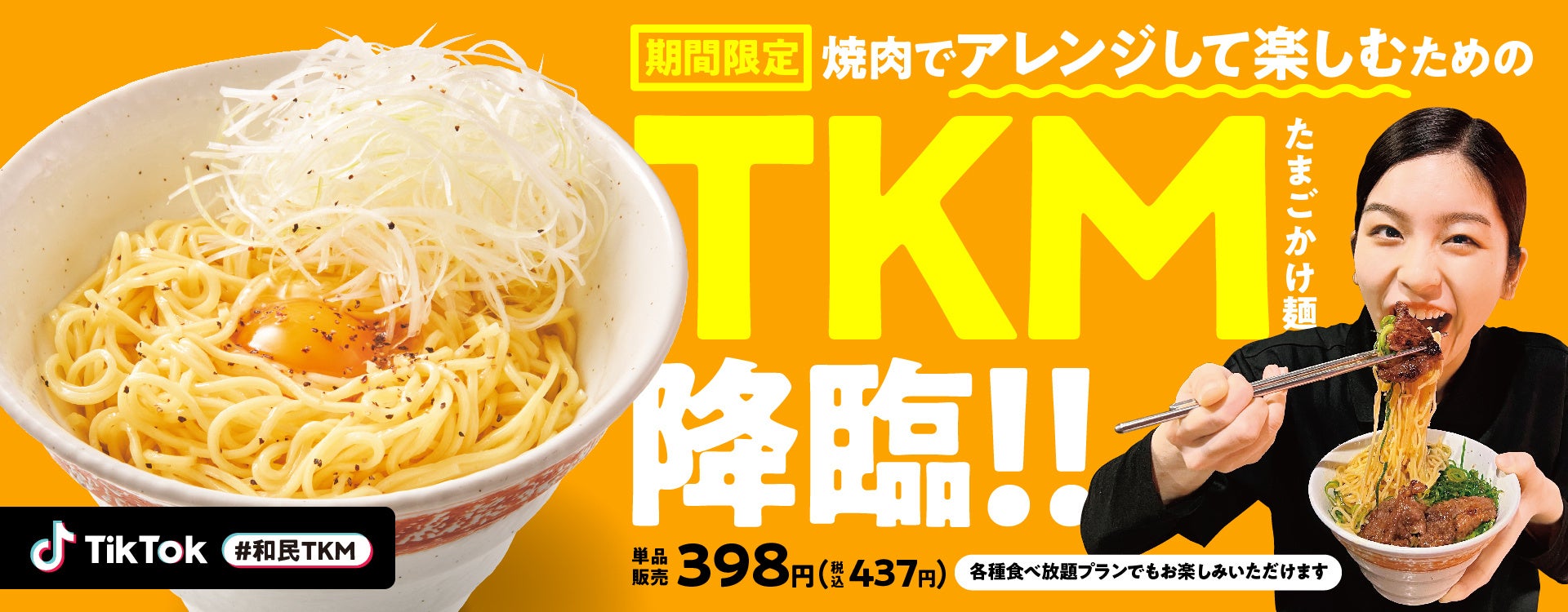 ご注文は単品販売としては1皿398円(税込437円)で、「食べホランチ」「学割食べホ」をはじめとするすべての食べ放題プランでもご注文いただくことが可能なため、仲間同士の集まりでお楽しみいただくことはもちろんのこと、おひとり様の焼肉ランチや仕事帰りのお食事としてでも自分好みのアレンジで「焼肉」×「たまごかけ麺(TKM)」をお楽しみいただけます。