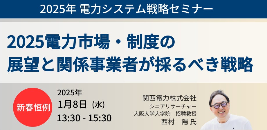 JPI(日本計画研究所)は、関西電力株式会社 シニアリサーチャー 大阪大学大学院 招聘教授 西村 陽 氏を招聘し、2025電力市場・制度の展望と関係事業者が採るべき戦略について詳説いただくセミナーを開催します。