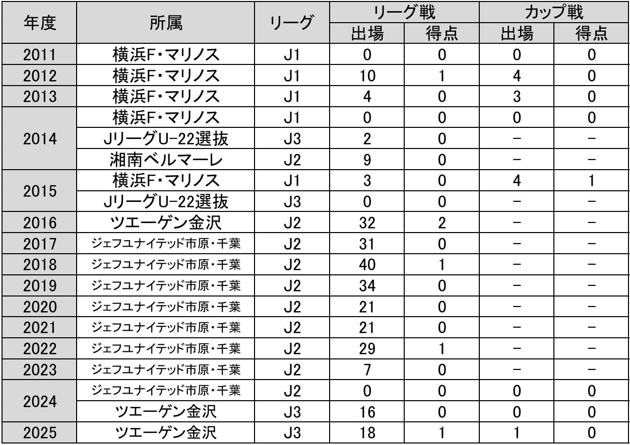 横浜F・マリノスプライマリー追浜 - 横浜F・マリノスJrユース追浜 - 横浜F・マリノスユース - 横浜F・マリノス - 湘南ベルマーレ - 横浜F・マリノス - ツエーゲン金沢 - 横浜F・マリノス - ジェフユナイテッド千葉 - 横浜F・マリノス - ジェフユナイテッド市原・千葉 - ツエーゲン金沢