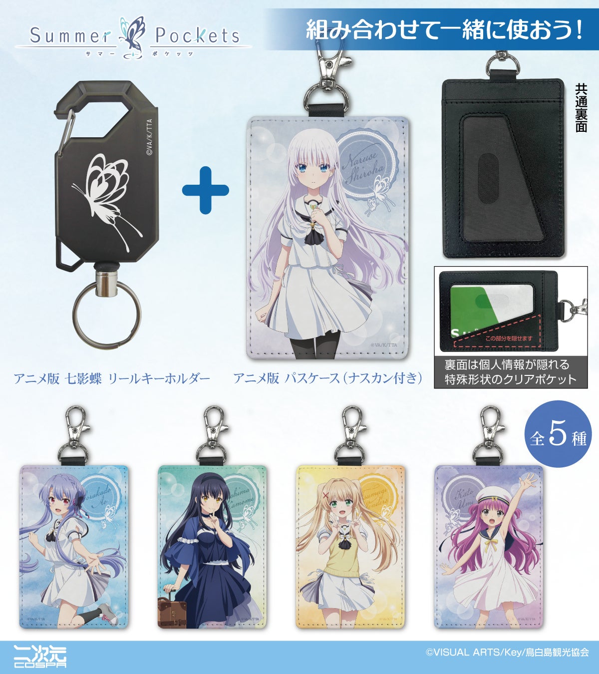 TVアニメ『Summer Pockets』より、「鳴瀬しろは」「空門蒼」たちのアクリルスタンドとパスケース、「七影蝶」のリールキーホルダーが二次元コスパから新登場。